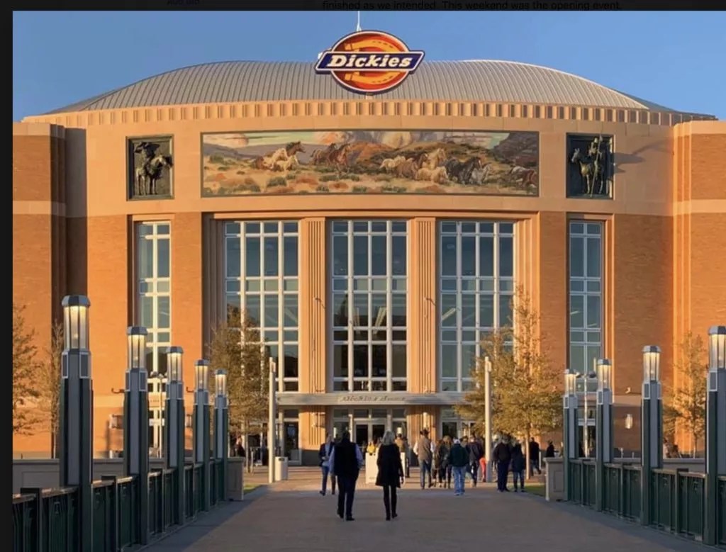 William Matthews was commissioned to create this mural flanked by sculptures at the Dickies Arenea in Fort Worth.