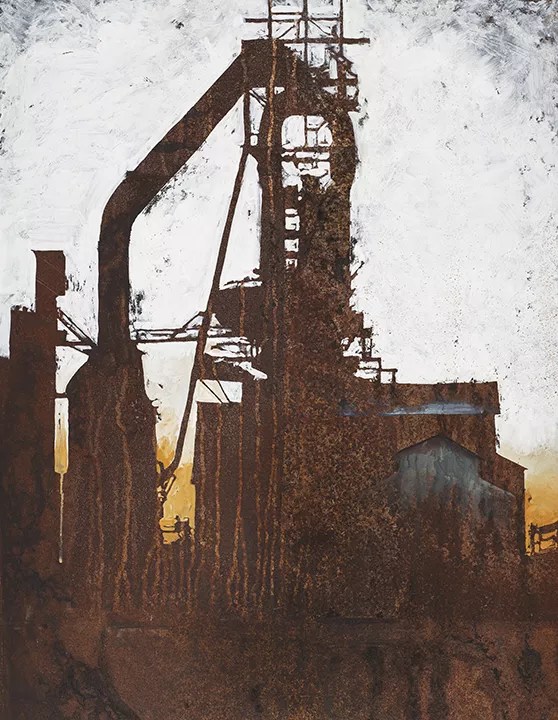 I went to Carnegie Tech in Pittsburgh in the ’60s. I was there over a summer taking a course in painting when the steel mills were all running, and I became enamored with those buildings: The sounds, the smoke and activity all got under my skin. I started painting those buildings, and dreamt about what they might look like inside. After pulling some strings, I got some guys to allow me access inside one. That’s when I knew I had to do a show based on that world. It’s not linear at all – it’s not just about the steel-making process. It’s also about how the steel is used, what the material is.