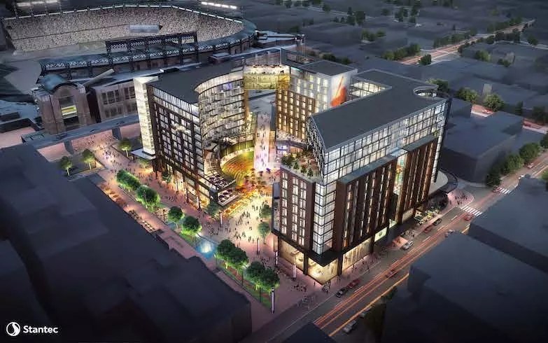 In March, the Rockies and its architectural design firm, Stantec, submitted a plan to the city that would add nearly 830,000 square feet of development to LoDo. Actually, not quite LoDo: This block was not included in the Lower Downtown Historic District, which means it also does not fall within the strict LoDo height restrictions, so in the plan, one building soars to eleven stories and the other to thirteen. They’ll hold 114 condos, an underground parking garage, a hotel, offices, bars, restaurants, retail space, and a 34,015-square-foot hall of fame and event space. In the center will be a plaza designed as a community gathering place, much as Wynkoop Plaza is today…though the Rockies liken this new space to Rockefeller Plaza.