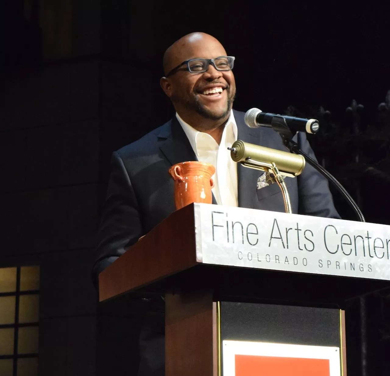 Idris Goodwin accepting the Pikes Peak Arts Council Literary Arts Award this year.