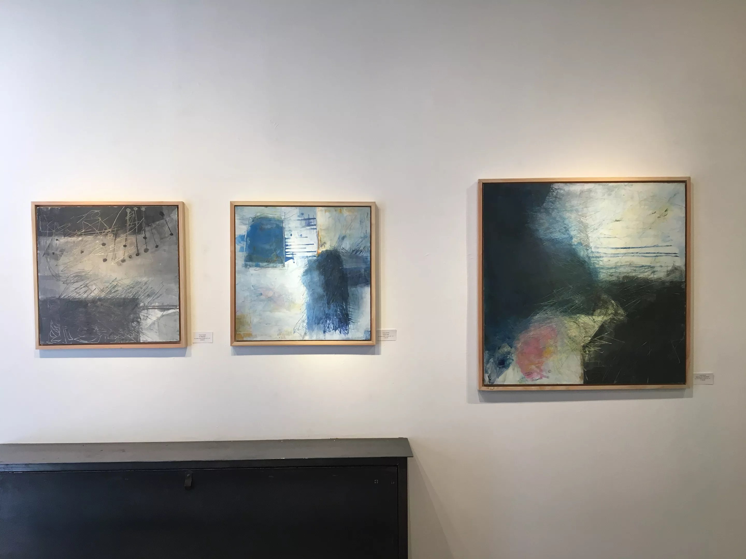In the southeast part of the gallery is Numinosity, elegant abstractions by Tracey Russell. Her paintings have veils of color-fields that have been marked by automatist scribbled lines. Using birch panels, Russell covers them with oil paint, oil stick and other pigments, plus graphite and wax; she then scratches them using different tools to create varied surfaces and those lines. In this way she is able to reveal underpainting in different areas of the composition, and the resulting paintings are somber versions of neo-abstract expressionism.