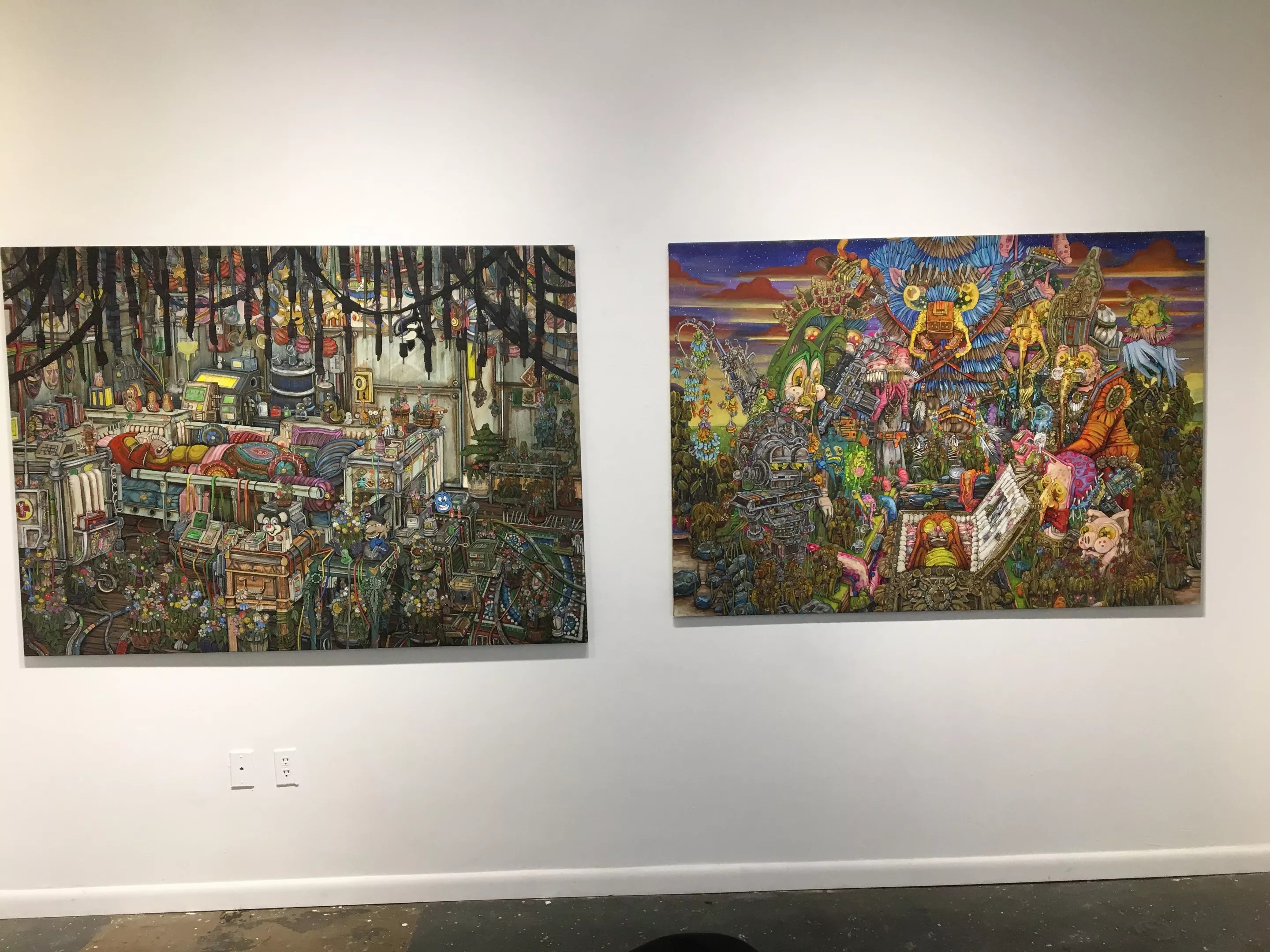There’s a genuine revelation In the annex off the entry: Radar Towers, incredibly accomplished paintings by emerging artist Gianni Coria. Though Coria is still in his twenties, these works demonstrate an extremely high level of technical ability. His gigantic, acrylic-on-canvas works are crowded with so many details, it’s hard to imagine that he could squeeze anything else in. Then there are the thousands of brush strokes needed to flesh out these details; surely, he couldn’t get one more of these in, either. Coria juggles many different interests in these staggeringly complex paintings: cartoon figures, depictions of ceremonies and processes (including hydroponics, as well as the plants and clouds that root the outlandish imagery into our earthly reality.