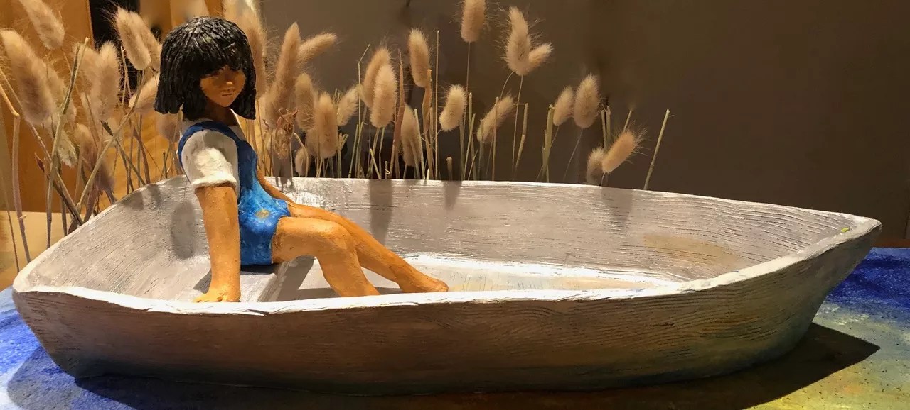 Knoll’s book club isn’t alone in its admiration for Owens’s novel, which is set in coastal North Carolina and invites the reader to wade into the marshes of a lush and possibly dangerous landscape. The bestseller is a coming-of-age story — heartbreaking in its details of the protagonist Kya, who is abandoned in stages by her family and left to fend for herself. Knoll says the exhibit is meant to invite viewers to “be absorbed back into the narrative through paintings, ceramics and delightful papier-mâché creatures placed prominently throughout the gallery.