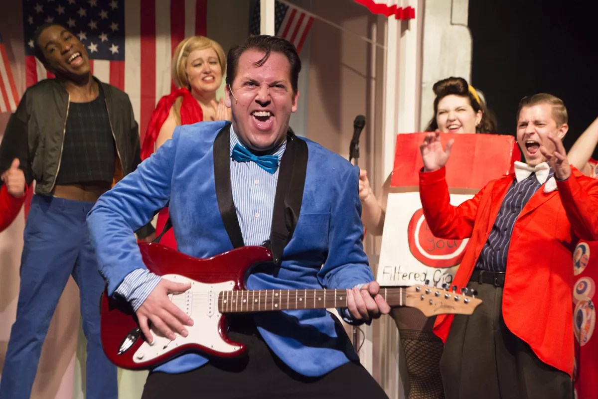 It’s 1950s America, and you know the plot. The Baltimore high school students are divided into two groups: nice, innocent kids and shady, low-class greasers who play hooky or skulk outside the schoolhouse smoking cigarettes, the boys in black leather jackets, the girls in funky jeans. Despite adult disapproval, one of the sweet girls falls for the bad-boy leader, tosses off her inhibitions, and lots of sexy dancing ensues. The musical Cry-Baby, which just opened at the Bug Theatre in a regional premiere by Equinox Theatre Company, is a parody of the genre; it’s based on a 1990 film by John Waters, who’s known for outrageous, salacious, larger-than-life, boundary-smashing work, and also for the candy-colored, campy sweetness of the musical Hairspray.
