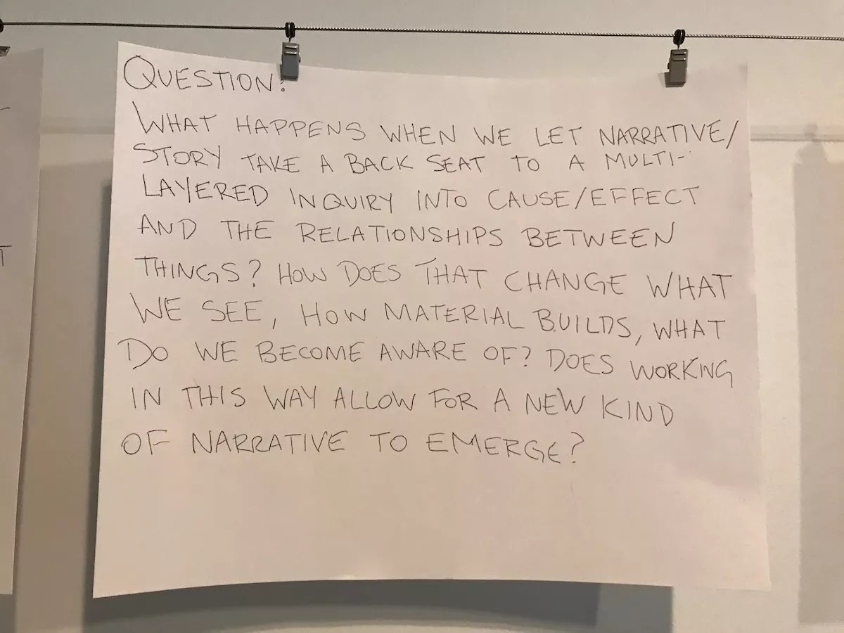 Samuelson’s residence alights throughout the Hamilton Building’s galleries, beginning in a designated hub space where she rehearses, live-types about her next moves from a projected computer screen, gathers written responses from viewers, and posts public notes on her process. But it’s pointedly an ever-changing experiment in discovery, for both Samuelson and her audience, regardless of where people find her, as she tries things out and interacts with museum-goers. Samuelson’s process notes line the hub space. Susan Froyd