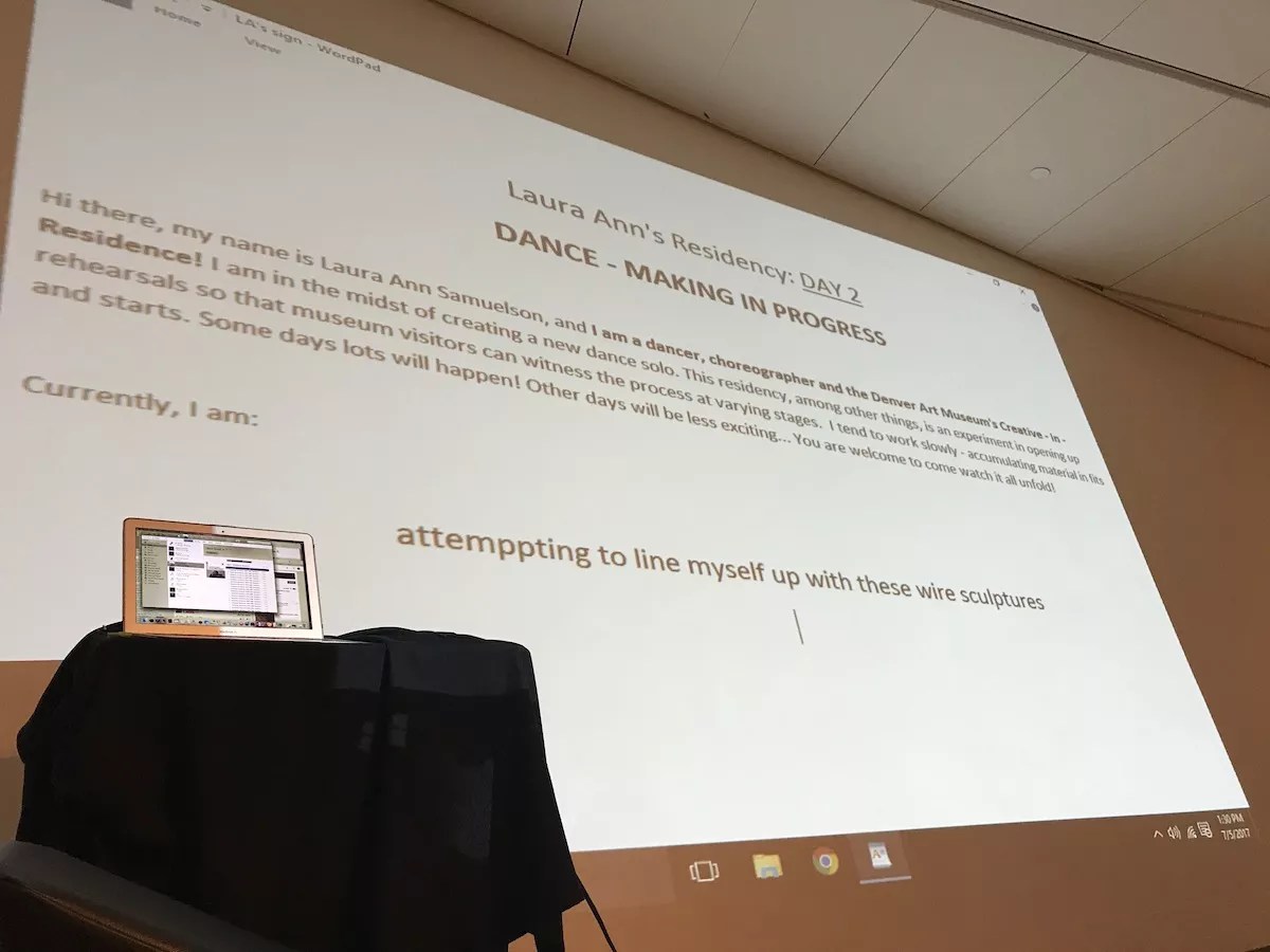 Laura Ann Samuelson keeps audiences informed with live writing as she rehearses in the DAM hub space.