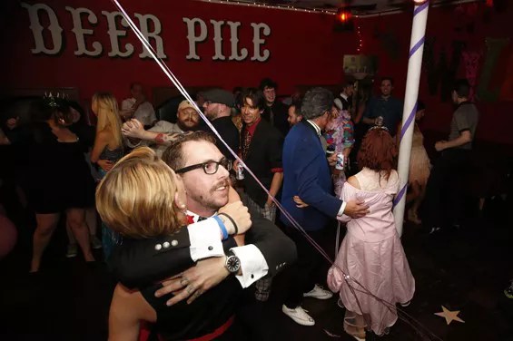 The crew had visions of painting it on a black wall, but worried that Landes would balk. Deciding to ask for forgiveness rather than permission, they went on a late-night mission to Home Depot for supplies, projected the photo onto the wall, and painted the outlines of the deer ménage Á trois. “The next morning, there were these three deer fucking on the wall, and Dan was like, ‘I love it!'” DeStefano recalls. “It’s a fucking deer pile,” someone jested, and the venue’s name was born.