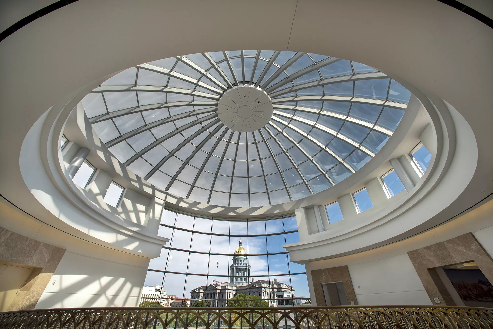 Carol Mikesh’s “Camouflage,” which won Best Detail in this year’s competition, is a perfect example of all three of those factors. The photograph shows the windows of a Denver high-rise reflecting the surrounding blue sky and clouds, with viewers only able to discern the building by indentations in the window framing. “There’s the architecture, but then there’s the play with the environment,” notes Johnston. The Best in Show photograph, “Justice Center Dome,” by Ernie Leyba, also compels viewers with such play, balancing interior and exterior with the gold dome of the Capitol as seen through the dome of the Justice Center.