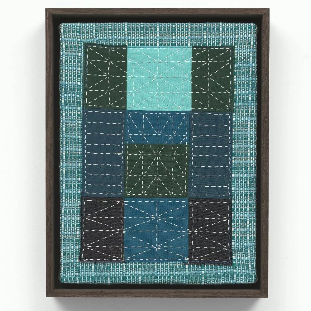 Paolo Arao, “Étude (Breakers),” 2024, hand-stitched cotton thread, pieced + sewn cotton and denim, and hand-woven cotton in a wood frame. Photo by Chromatics Studio, NYC