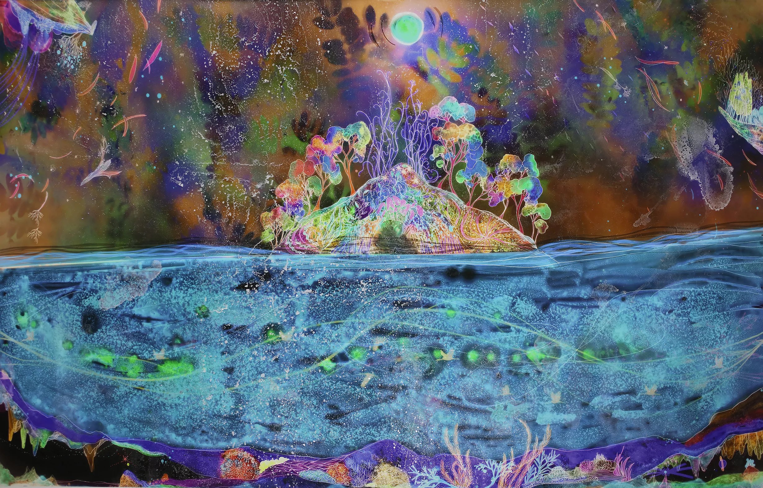 Christine Nguyen, "Auroral Island," 2021, archival pigment inks on Entrada Moab paper with salt crystals.