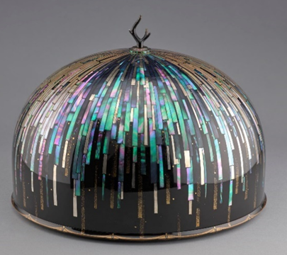 Sano Keisuke’s “Budding of Recollection” features iridescent strips of mother-of-pearl on a domed lid, commenting on the universal notions of attachment and memory. Crowning the box is a minuscule finial. “By treasuring an object and stowing it away, we, in effect, instigate a process of forgetting,” Keisuke notes in the DAM announcement.
