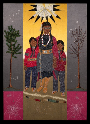 Teri Greeves of the Kiowa Tribe used plant material from the Northern and Southern Plains regions of what is today the United States to hand-dye the background composition of “Sons of the Sun.”