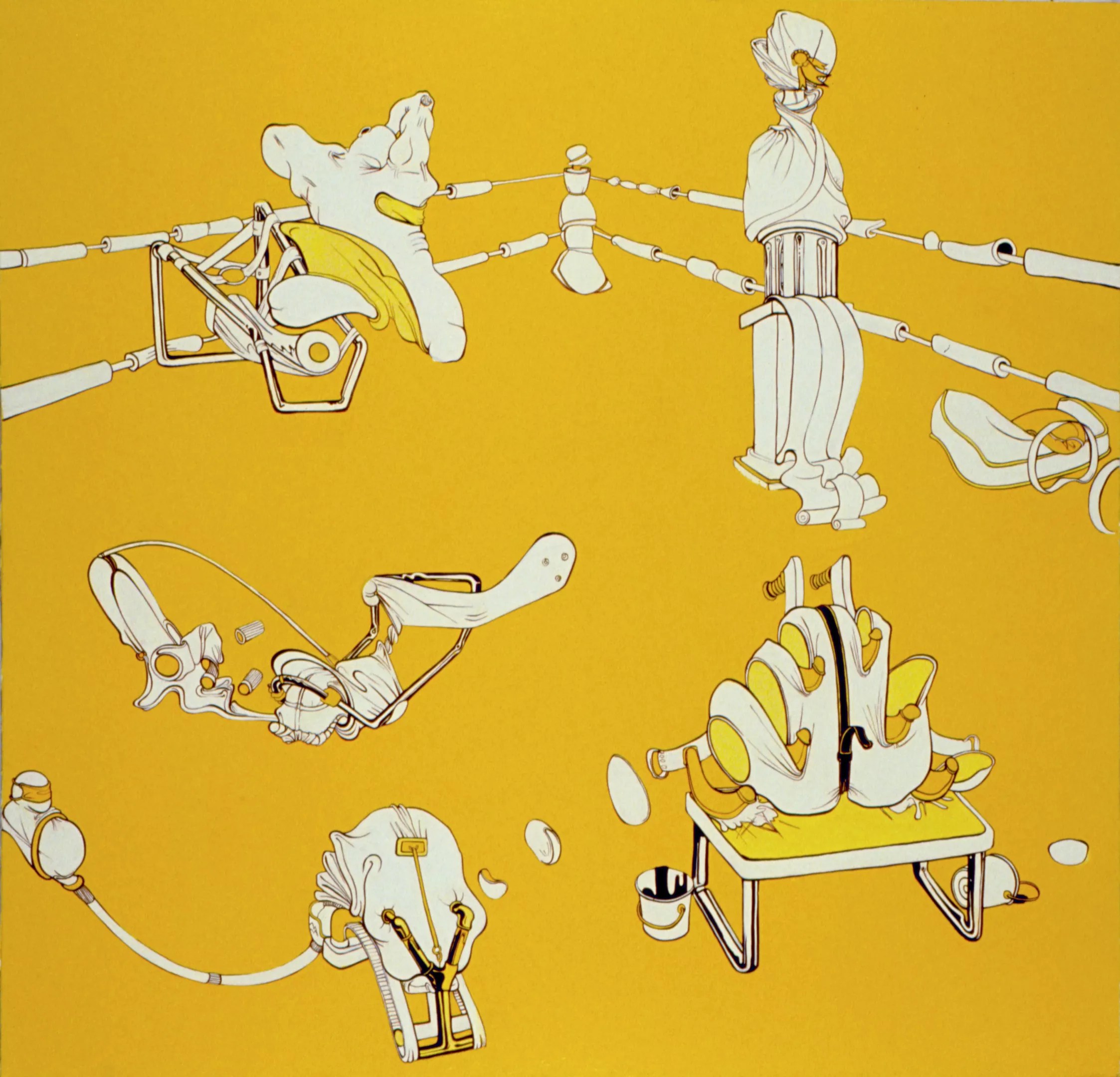 “Plastic Surgery,” a painting by Inka Essenhigh, directly addresses an “of the now” topic. The pervasive issue of body image is illustrated by surrealist white subjects cut up in a boxing ring on a striking yellow background. The curators have tied together some works with pop-culture references hung on the wall next to them: “Plastic Surgery” is emphasized by a video playing on an iPad that shows a model going through the process of retouching at a photo shoot; next to that is a framed Instagram post discussing how body poses can change how your weight comes across in photos.