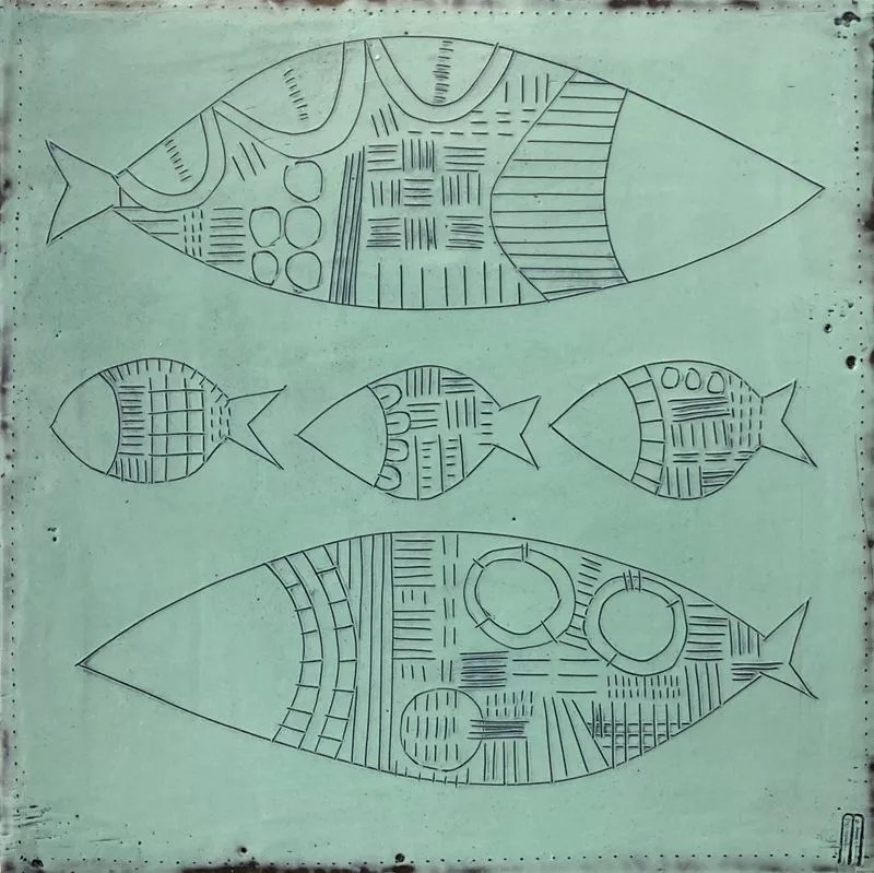 Michele Messenger, “Fish Family,” encaustic.
