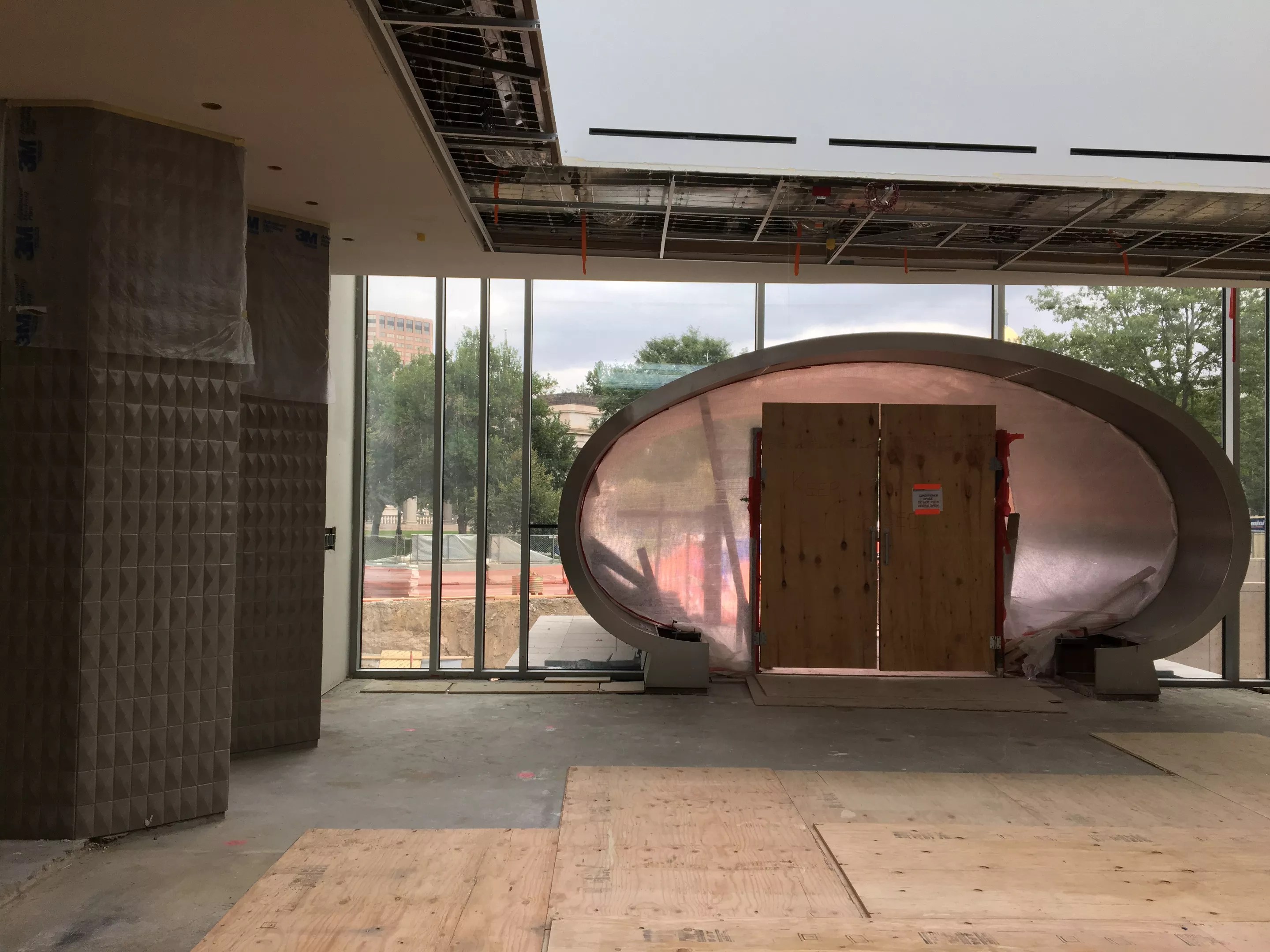 Corning, the original maker of those glass tiles, no longer does that kind of work, so Lamberts, a German company, replicated the originals, this time in ceramic. There are two tile-clad columns just beyond the tube, and even under close examination, the differences between the old and new ones are all but impossible to perceive. That stunning elevator lobby is gone, but it was sacrificed for a good cause: the addition of another double bay of elevators (a much better solution than putting them on the exterior, an idea kicked around for a while). The Bonfils-Stanton Gallery beyond is being reconfigured, its ceiling lowered a story; meanwhile, the gorgeous, double-height Ponti Hall opposite the tube is being converted to the Bartlit Learning and Engagement Center, including the Creative Hub.
