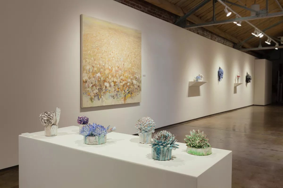 September marks the beginning of the new art season, with the long-running shows of summer finally closing and the first of the fall shows opening. Goodwin Fine Art is coming out strong with a pair of heavy-duty solos: Rebecca Cuming: XXI Century Field and David Hicks: Stone Flora & Blue Cuttings. Gallery owner Tina Goodwin’s pairing of the Cuming paintings and the Hicks ceramics is inspired. Though the works are very different visually, they share a conceptual underpinning: What start as depictions of plants wind up as abstracts. Wes Magyar