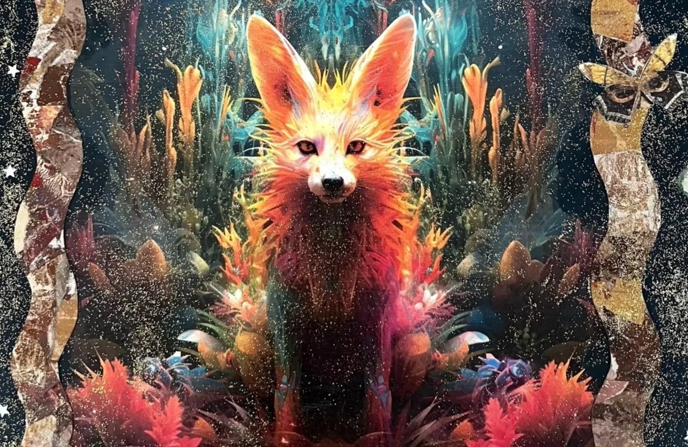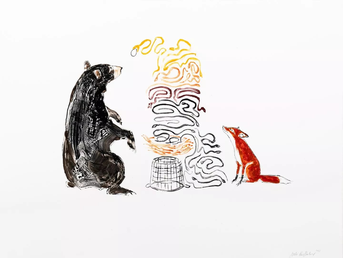 Julie Buffalohead, “Intrigue,” 2023, monotype.