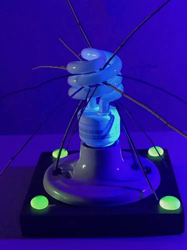 Steven Shugart, “A Little Poem,â€Â fluorescent light bulb, twigs, lamp holder, padauk, uranium glass beads, brass screws under black light.