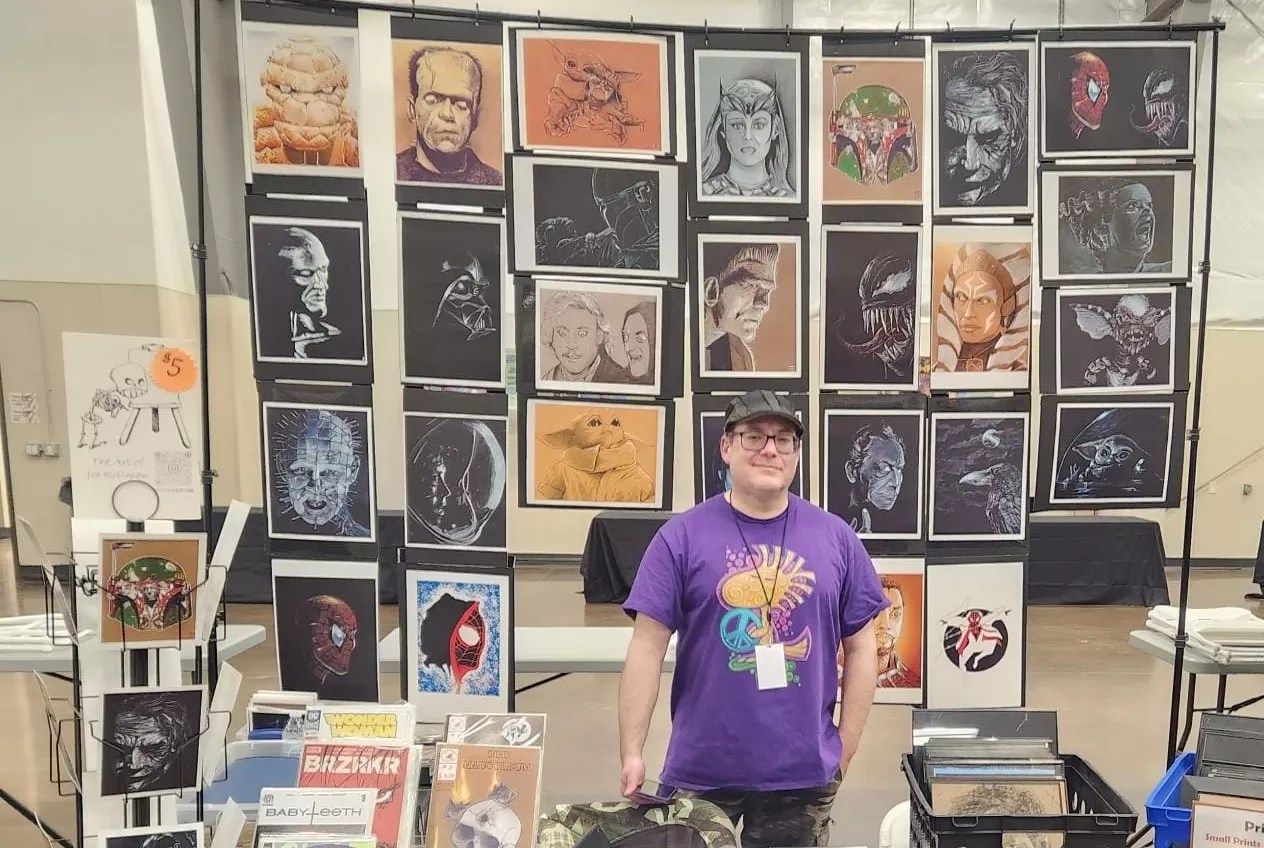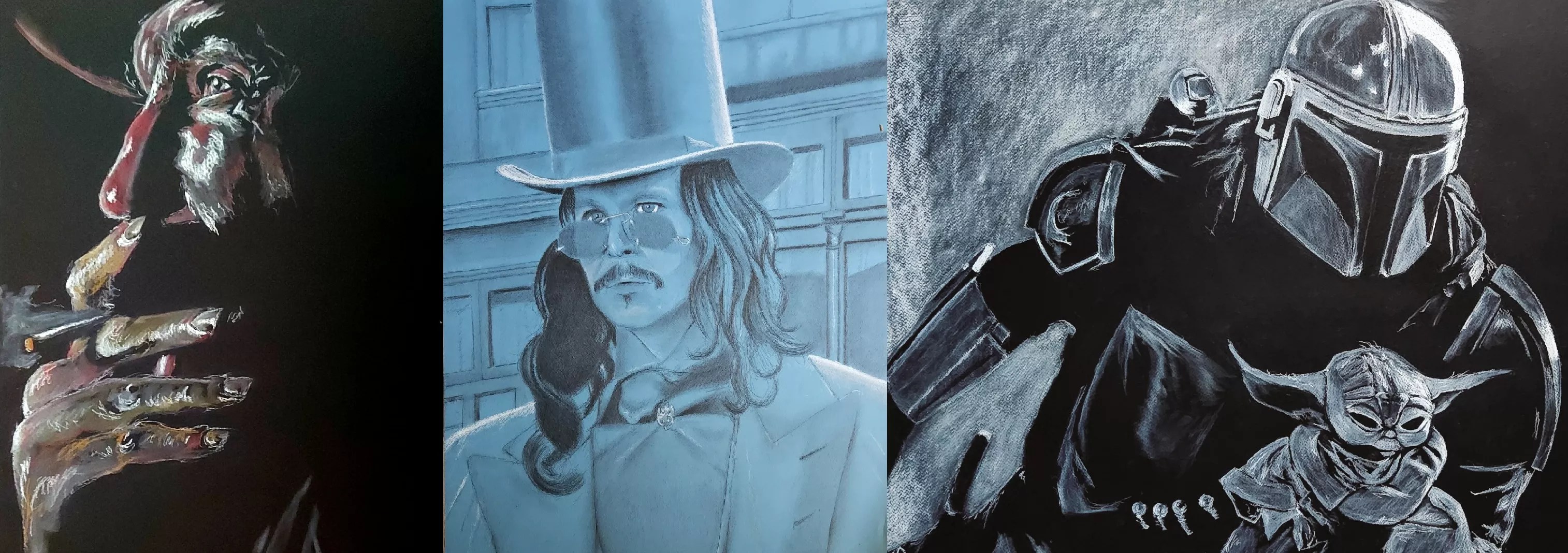 It’s a wish worthy of a Tim Burton story: part love, part horror, all heart. That describes Rollman’s body of work, as well, which runs the gamut from renderings of movie characters (Godzilla, Frankenstein and Daniel Plainview from There Will Be Blood) to comic book characters such as the Hulk and pop-culture icons like the Mandalorian and Gary Oldman’s Dracula. Rollman says he draws and paints what he likes, and “I get lucky because the things I like tend to also resonate with other people. Almost as much fun as drawing Godzilla is standing and talking to somebody for twenty to thirty minutes about how much they love Godzilla.”