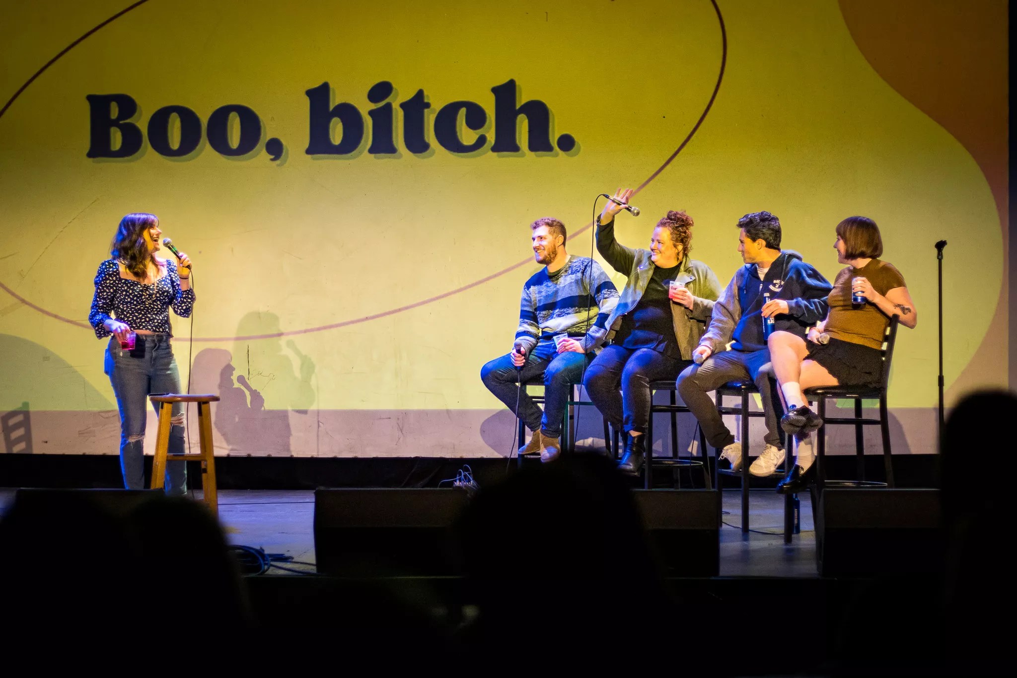 The event typically starts with the audience answering a dating question on slips of paper to be read aloud by the comedians. Past shows have resulted in Q&As like, “What’s the biggest red flag you’ve ignored? — When he left his toenail clippings on the counter.” Or, “What’s your craziest ick? — When he throws a bowling ball like a little bitch.”