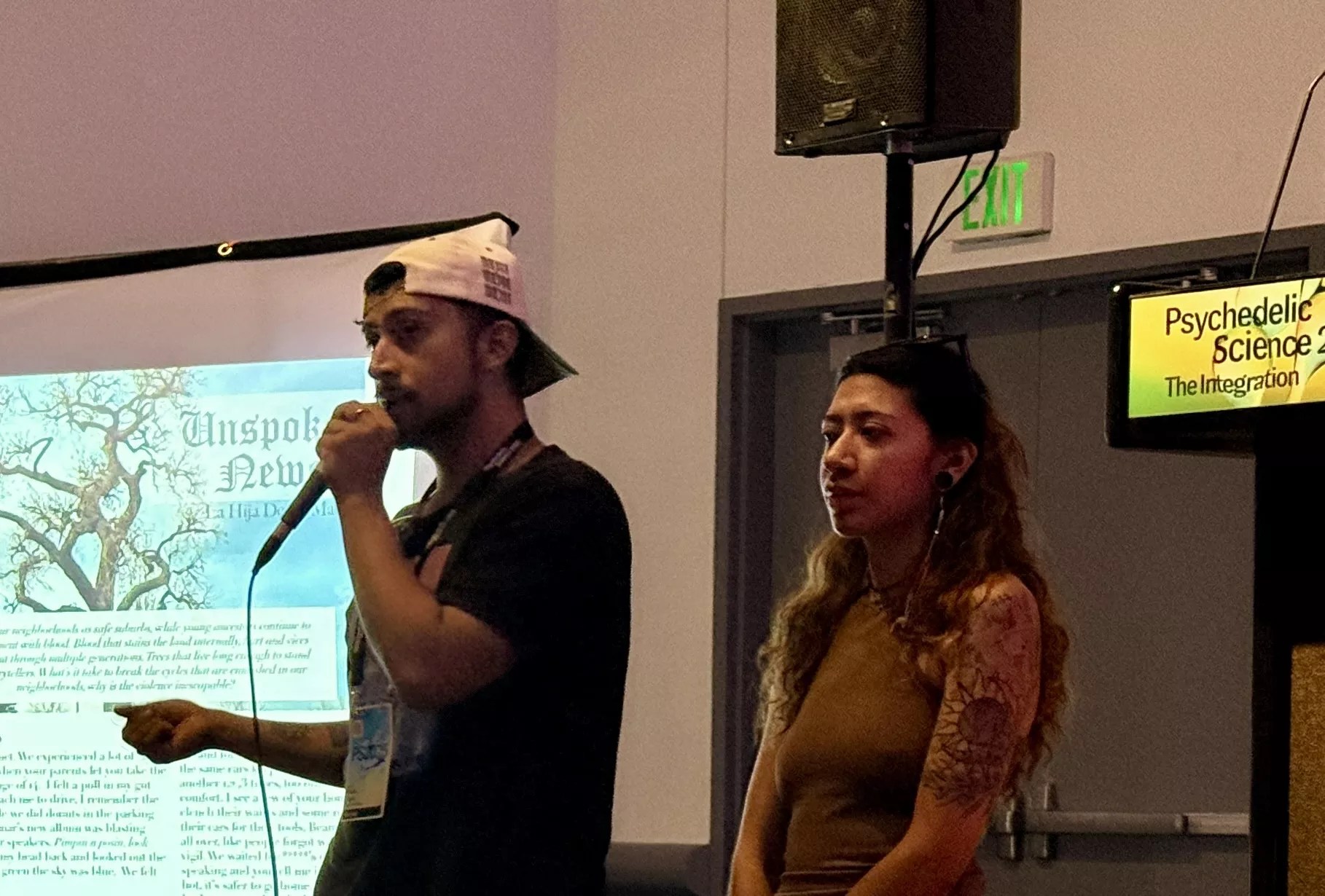 Mario Reyes and Honey BuendÃa of the Dystopian Times collective during their presentation at Psychedelic Science 2025