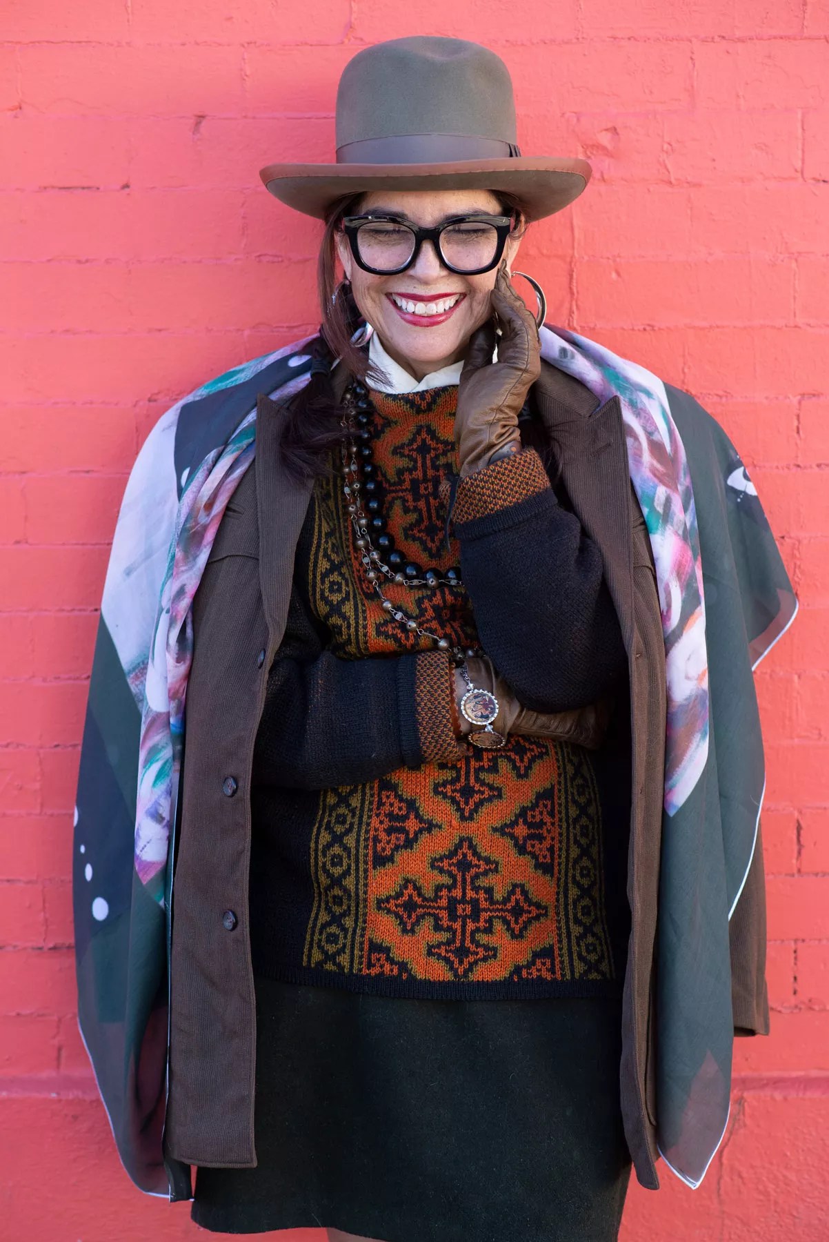 She’s currently preparing for Fashion West, a two-night event on August 15 and 16 that features hairstylists and fashion designers from the western region. She plans to offer an entirely new collection. A sneak peek on her Instagram shows a few outlaw looks, with cowboy hats, ponchos, denim and, of course, colorful scarves. Lucero says the jumping-off point for the collection was an old cowboy hat given to her by a friend, and it evolved from there. “The cowboy look comes and goes in Denver. I’ve not really been into it until recently. I’ve done ponchos for a while, and I always love using wools and denim. I was going to show this collection in the summer, but the clothes are actually more suitable for the fall.”