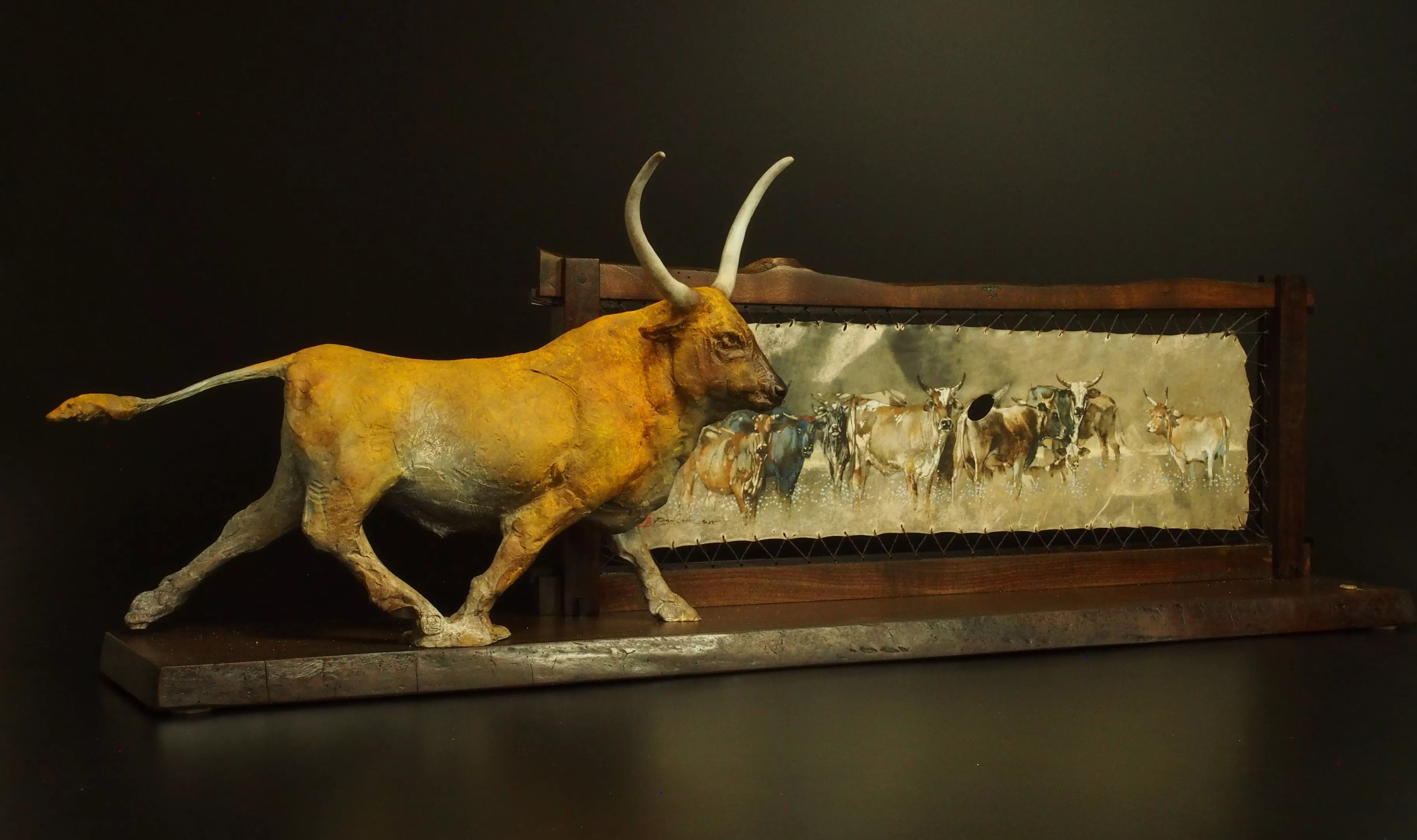 Coors Western Art Exhibit 2023 featured artist Dan Chen, “Gaze and Graze,†bronze, wood and parchment.