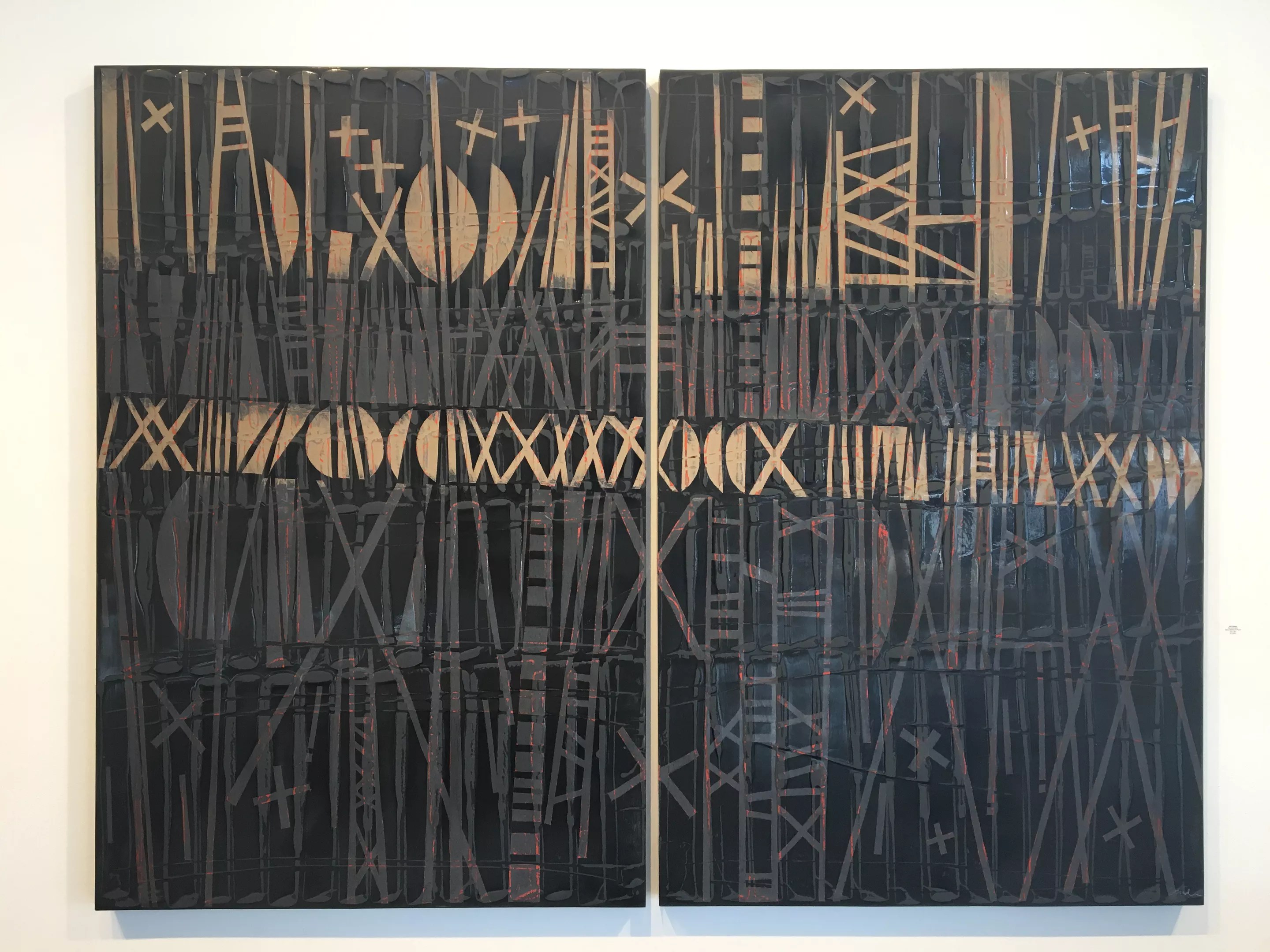 The bold colors that Wood uses are the polar opposite of the dark and tightly organized paintings by Bill Snider, which are covered in pseudo writing of geometric symbols laid in lines of imaginary text. The surfaces are really complex, with an almost antique look and a range of colors underneath bleeding through to the top coats. Snider has said that he’s been equally inspired by tribal art and graffiti.