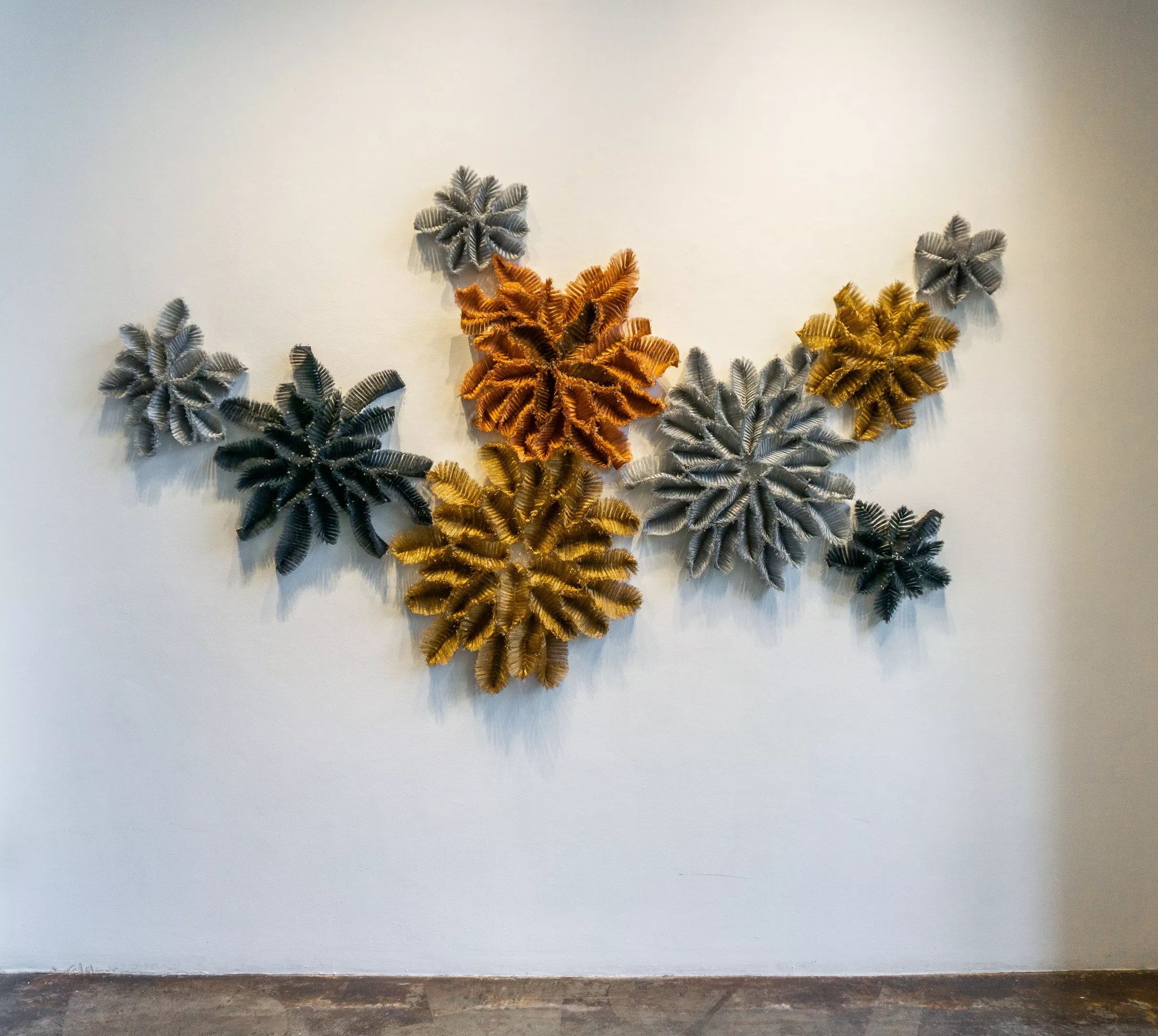 Several artists play with floral imagery in their works, including the spattered yet still realistic images of plants and flowers in Cara Enteles’s paintings. Brian Comber contributes vaporous watercolors of blossoms. Doug Haeussner has created intriguing deconstructed digital photos that look like paintings of branches. Finally, there are the multi-panel acrylic and paper pieces by Karin Schminke, which are tremendous. Schminke covers the panels edge to edge with dense patterns of lines evocative of vines. They are individually carried out in neutral shades of brown, gold, gray and black. She presents them in sets of two, three and even four, with each of the prints different in imagery and colors. Snail-assisted wall pieces with bee-assisted sculptures in the foreground at Mai Wyn. Robert Delaney