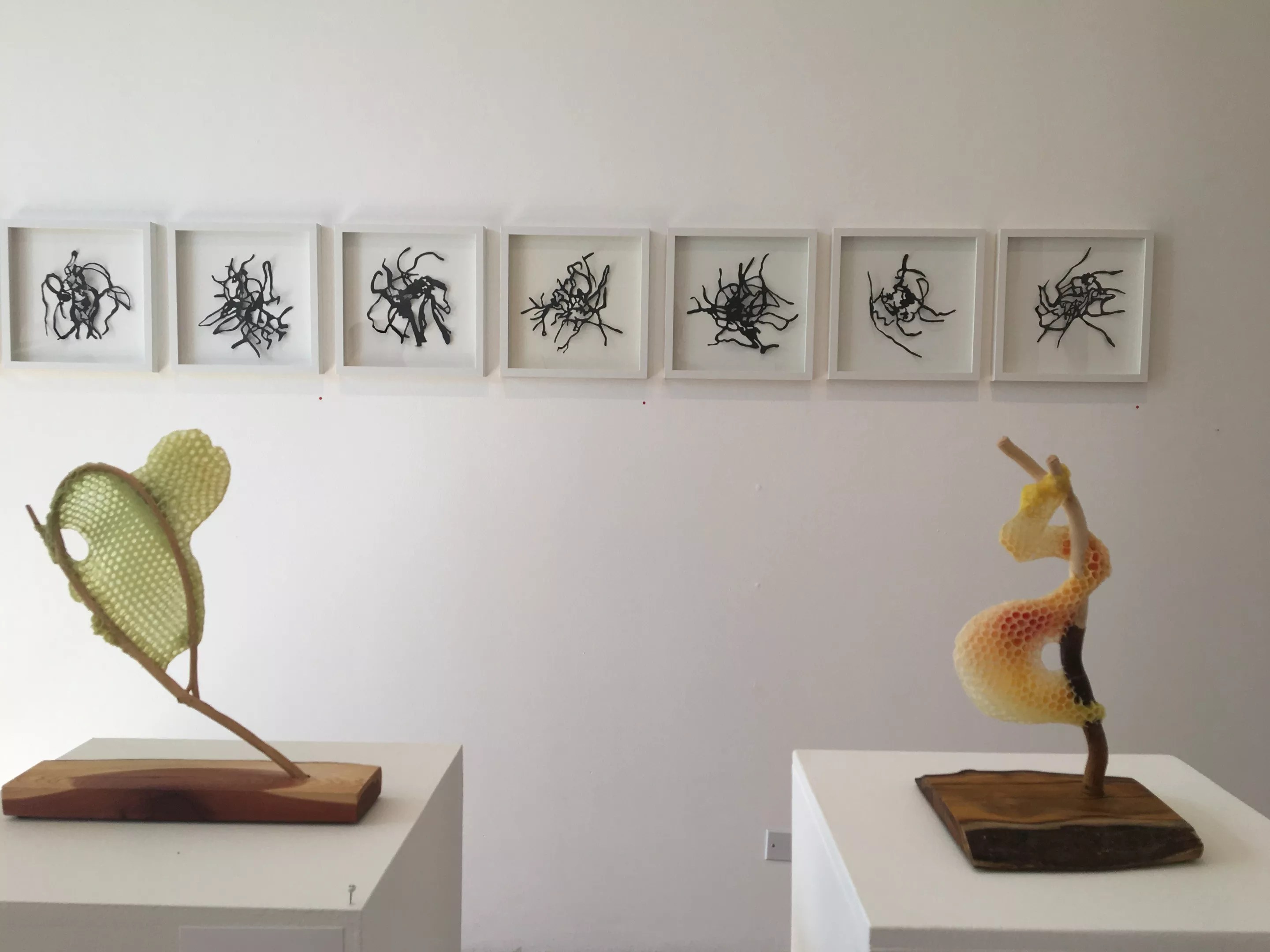 Murphy’s most recent pursuit is collaborating with bees. Using apiary techniques, she encourages bees to create combs according to designs she’s conceived. These combs, which are sometimes colored with natural dyes so as not to endanger the bees, hang or are otherwise attached to twigs, both in the form of small sculptures or bas-reliefs. I was amazed at how well the snail wall pieces worked with the intimate tabletop honeycomb sculptures.