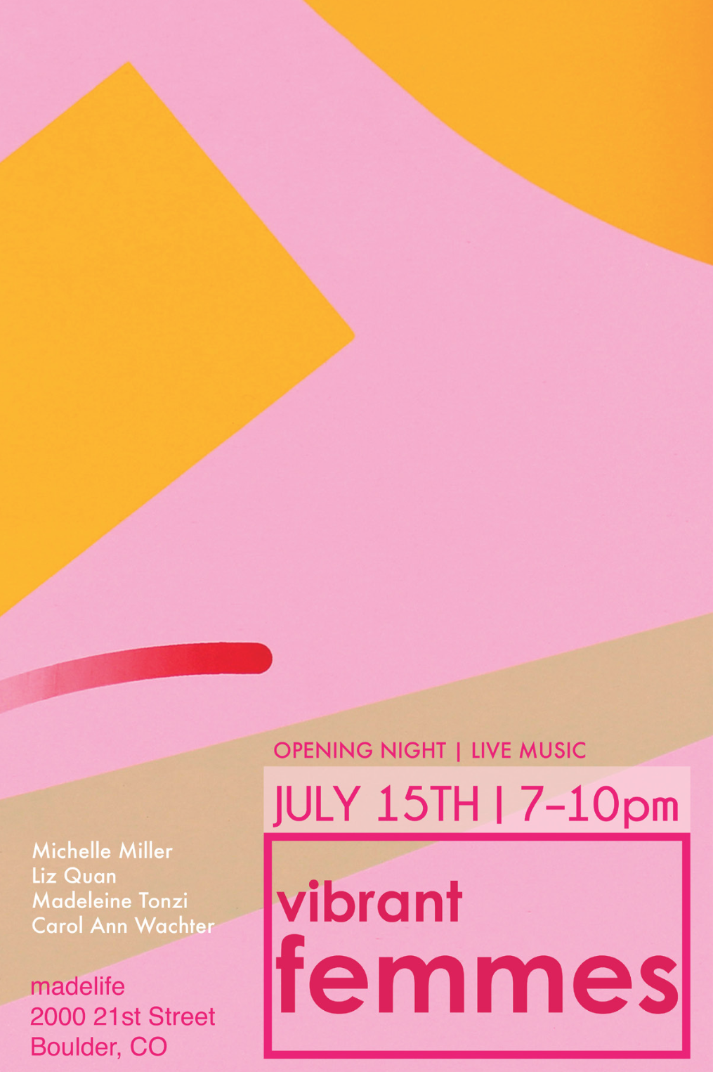 Four regional women artists messing with color, creation and natural forms take over Boulder’s madelife space for a show that focuses on the role of artists as makers. Printmaking, drawing, fashion design and sculpture all have a place in this show, which opens with live music by DJ L.A. Zwicky and Dream Harlowe and also doubles as a public wall-mural dedication party.