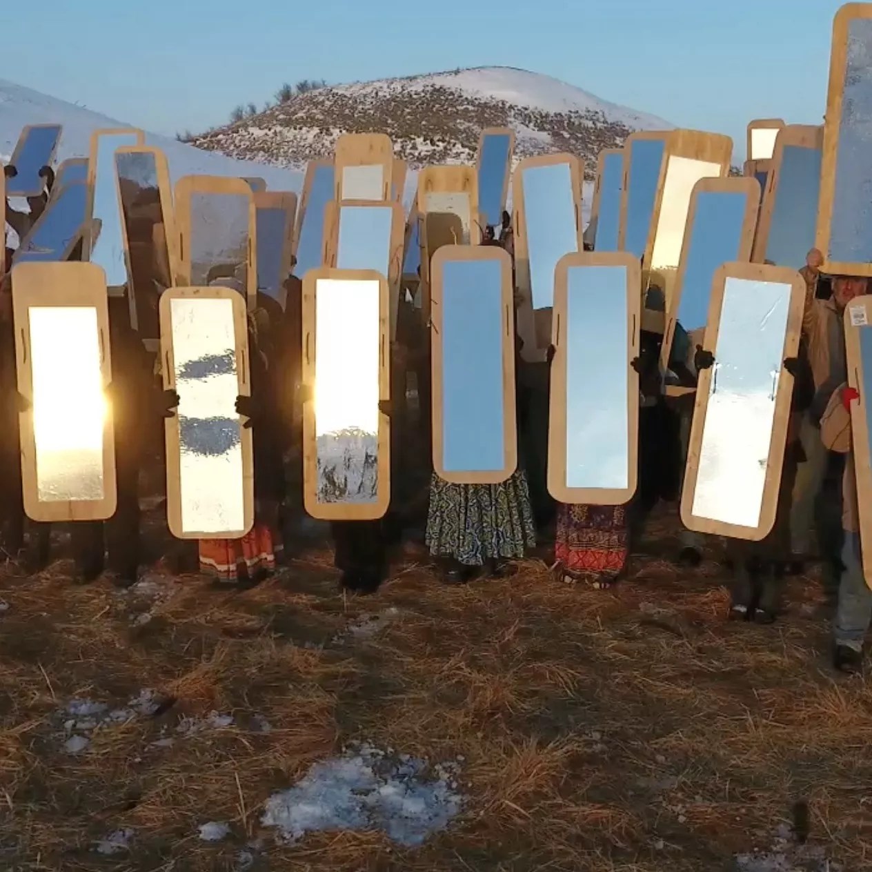 Cannupa Hanska Luger, _Mirror Shield Project” (detail). Action on November 18, 2016 at Oceti Sakowin Camp, Standing Rock, North Dakota, organized in collaboration with Rory Wakemup.