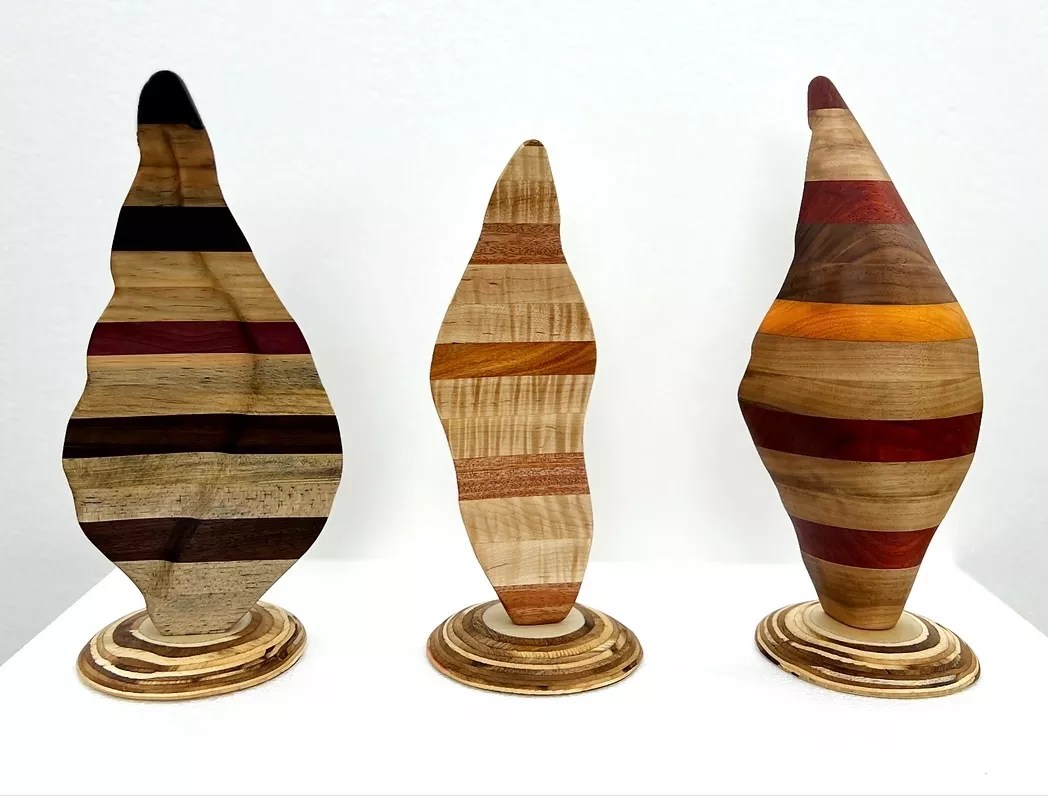 Nathan Dominik, “Leaves of Wonder 1, 2 & 3,†mixed exotic hardwoods.