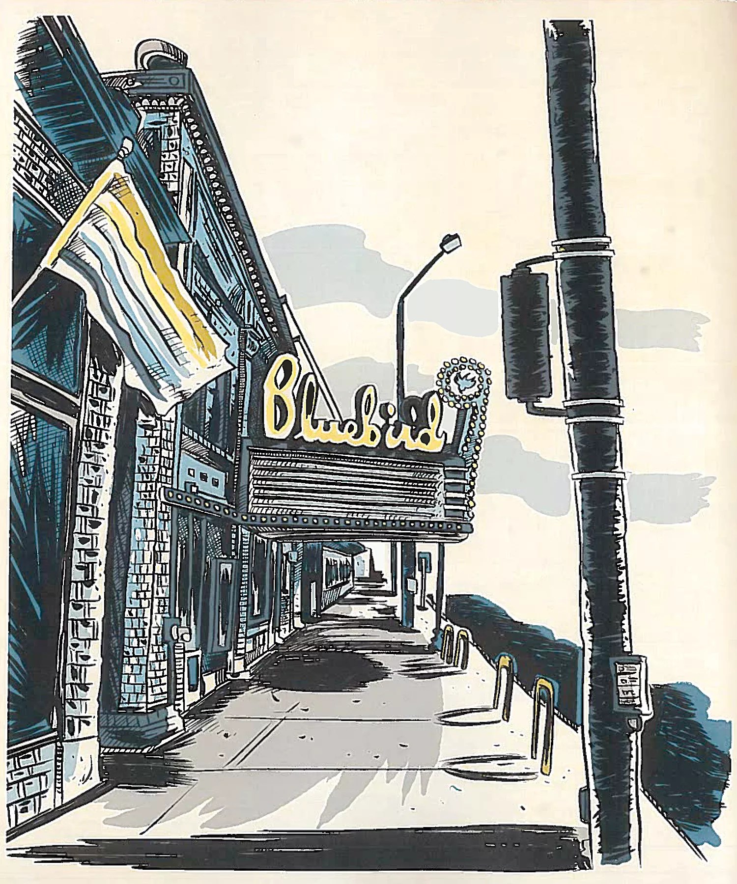 Queen City was first conceived as a thin volume based on banners that Krumpholz had drawn memorializing such Denver venues as the Lion’s Lair and the Bluebird Theater for the Colfax Avenue Business Improvement District. But with shutdowns hitting the city, he and Tinto Press changed their approach. “I wanted to draw everything we knew was going away,” Krumpholz explains.