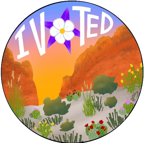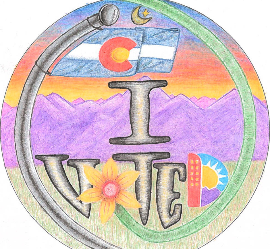 The state of Colorado also held a sticker design competition, though it was more traditional than Denver’s. In the end, Cosmo Bell won. The Fort Collins high-schooler created a sticker that shows a rocky pass in the Garden of the Gods with “I Voted” written in the sky. The “o” in “voted” is a Columbine, the Colorado state flower.