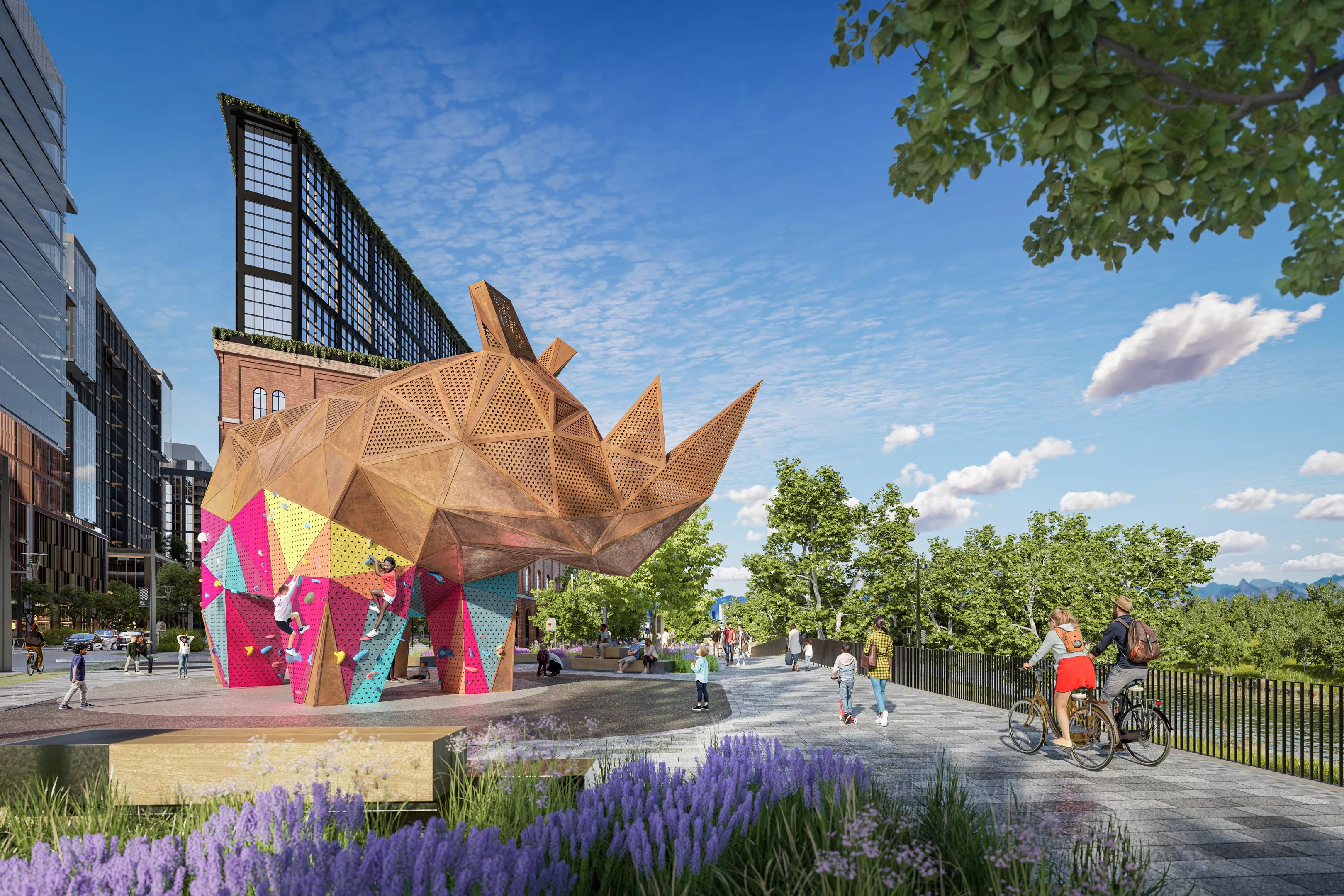 The first phase broke ground in September 2023. The current phase of the project includes more than four acres of public open space and amenities, such as new sports courts and a revamped dog park (which opened last October), a pedestrian plaza, a half-acre of green lawn and pop-jet fountain, pedestrian sidewalks and protected bike lanes, a playground and the massive rhino climbing sculpture, which Newman says was “a playful nod” to the RiNo Art District.
