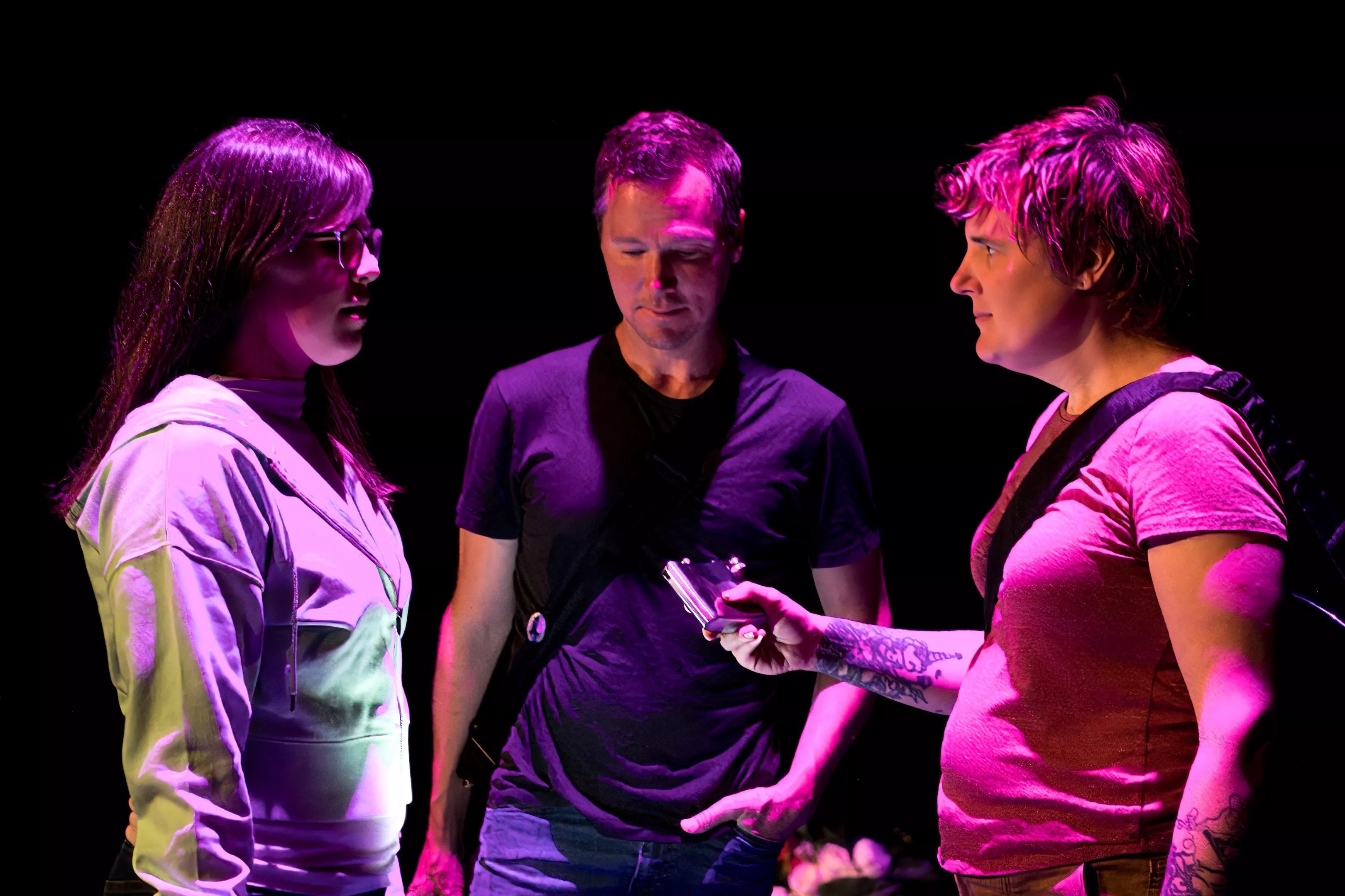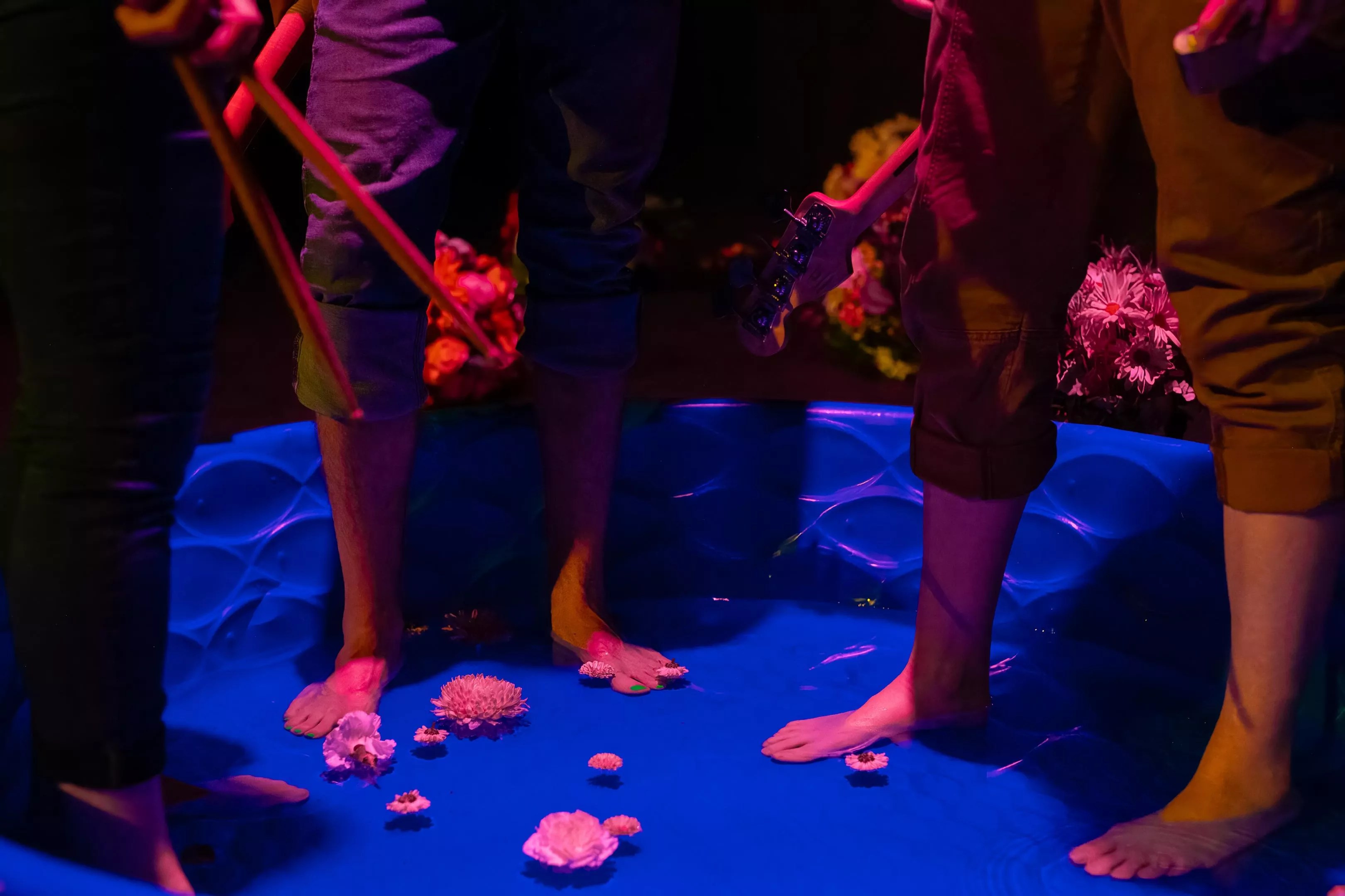 “We are setting it up as if it were a concert, even though we are in a theater,” says Julie Rada of Grapefruit Lab. “We have openers, but unlike a concert, we are being a little more deliberate about costuming and lighting. Along the way, the concert starts to unravel into this sort of extemporaneous conversation that relives old memories and explores identity. We have an old-school overhead projector that is used for telling stories, and there is a kiddie pool with water in the center of the stage — which is not a spoiler, because it is there from the moment people walk in, but it is something they must contend with.”