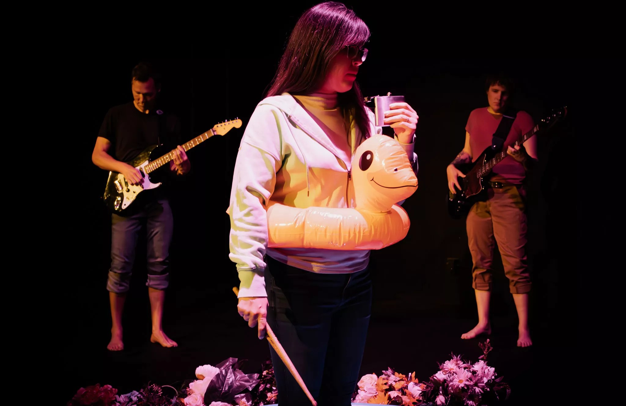 “We are setting it up as if it were a concert, even though we are in a theater,” says Julie Rada of Grapefruit Lab. “We have openers, but unlike a concert, we are being a little more deliberate about costuming and lighting. Along the way, the concert starts to unravel into this sort of extemporaneous conversation that relives old memories and explores identity. We have an old-school overhead projector that is used for telling stories, and there is a kiddie pool with water in the center of the stage — which is not a spoiler, because it is there from the moment people walk in, but it is something they must contend with.”