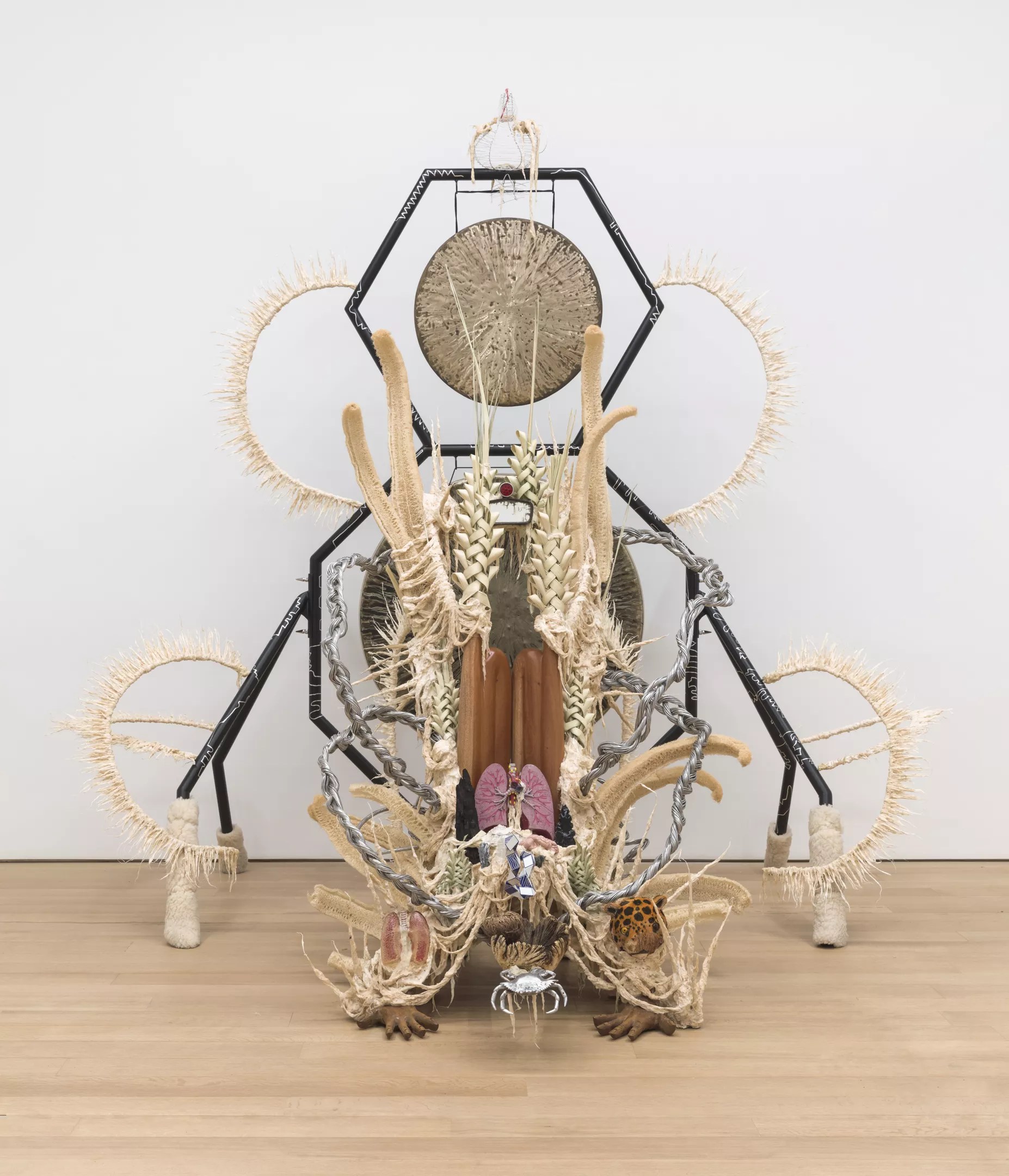 That acoustical exploration continues in Guadalupe Maravilla‘s exhibition, curated by guest curator Larry Ossei-Mensah. Maravilla will display a brand-new sculpture commissioned by the MCA called “Purring Monsters With Mirrors on Their Backs.” The piece incorporates six gongs with a variety of materials and objects collected while Maravilla retraced his original migration route from his home country of El Salvador to the U.S. After coming to this country as an unaccompanied minor, he was later diagnosed with colon cancer while in his MFA program. That personal history is deeply tied to his work.