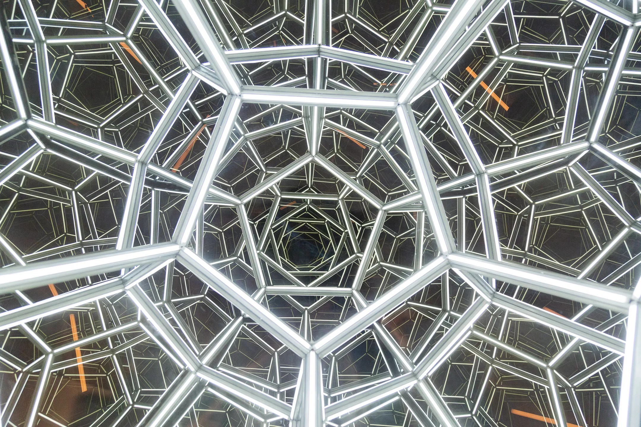A peek inside the mirrored dodecahedron gives the illusion of infinite patterns.