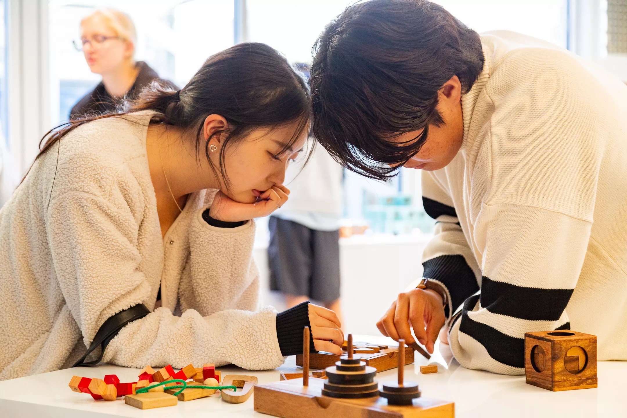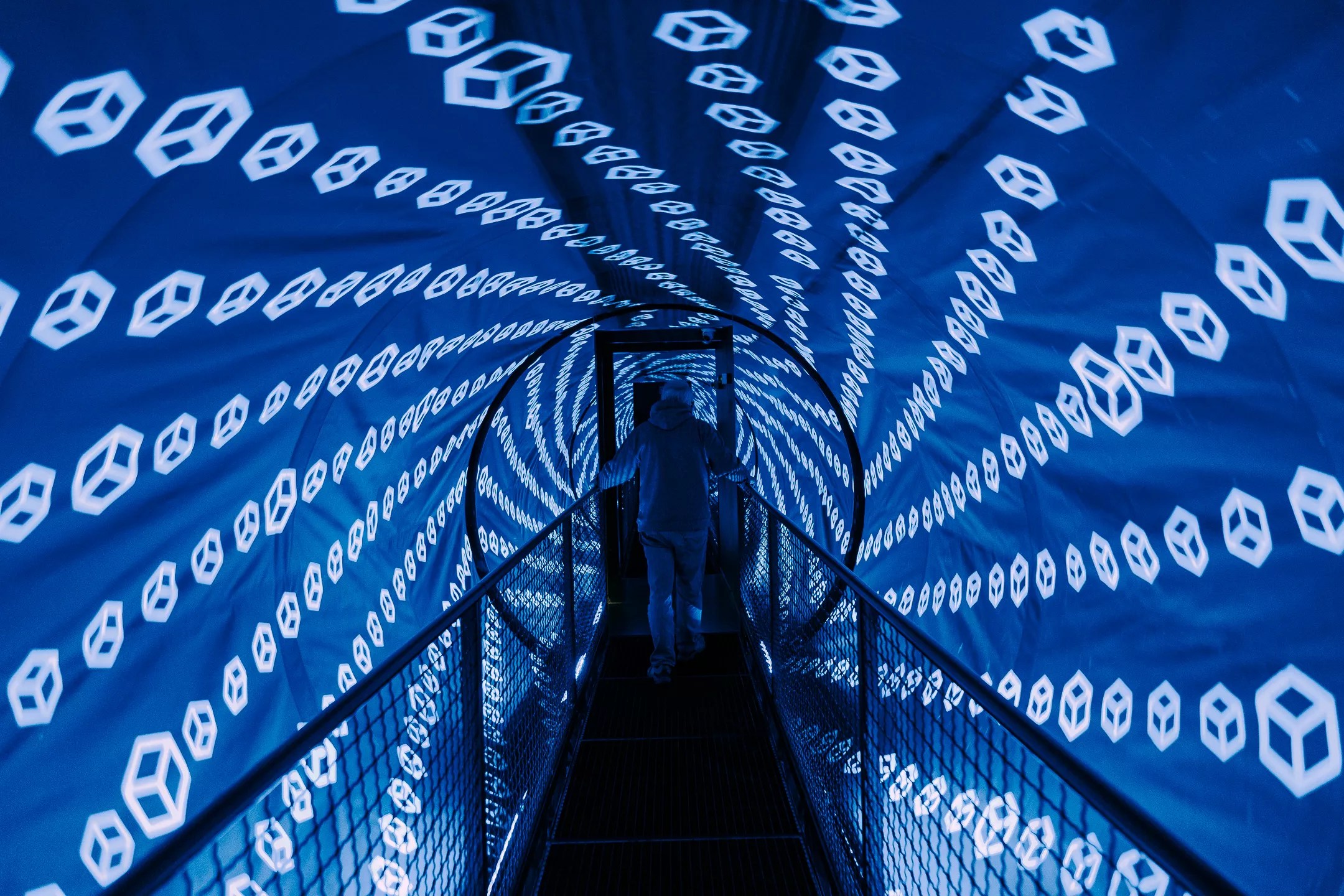 Employee Arik teaches patrons how to use a mirrored installation for photos.