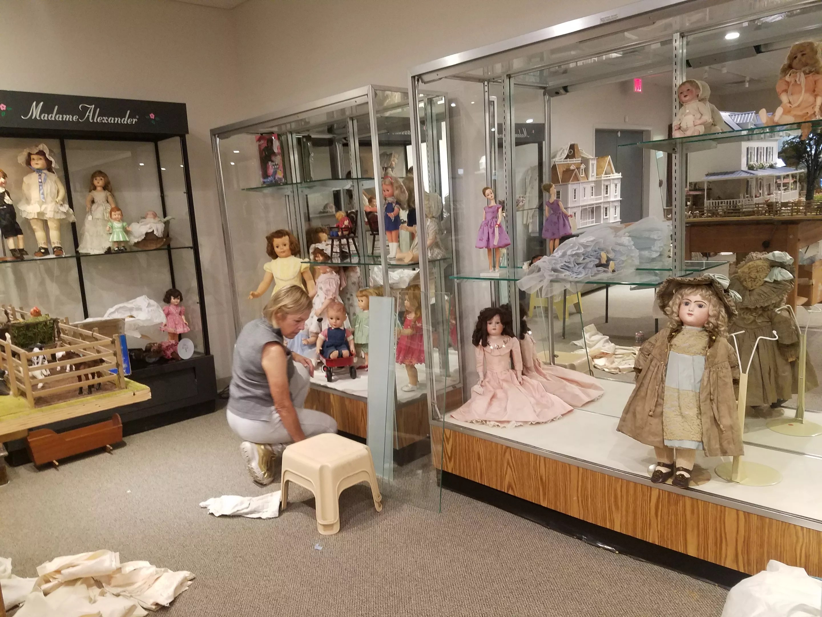 A volunteer arranges dolls in display cases at the new home of the Denver Museum of Miniatures, Dolls and Toys.