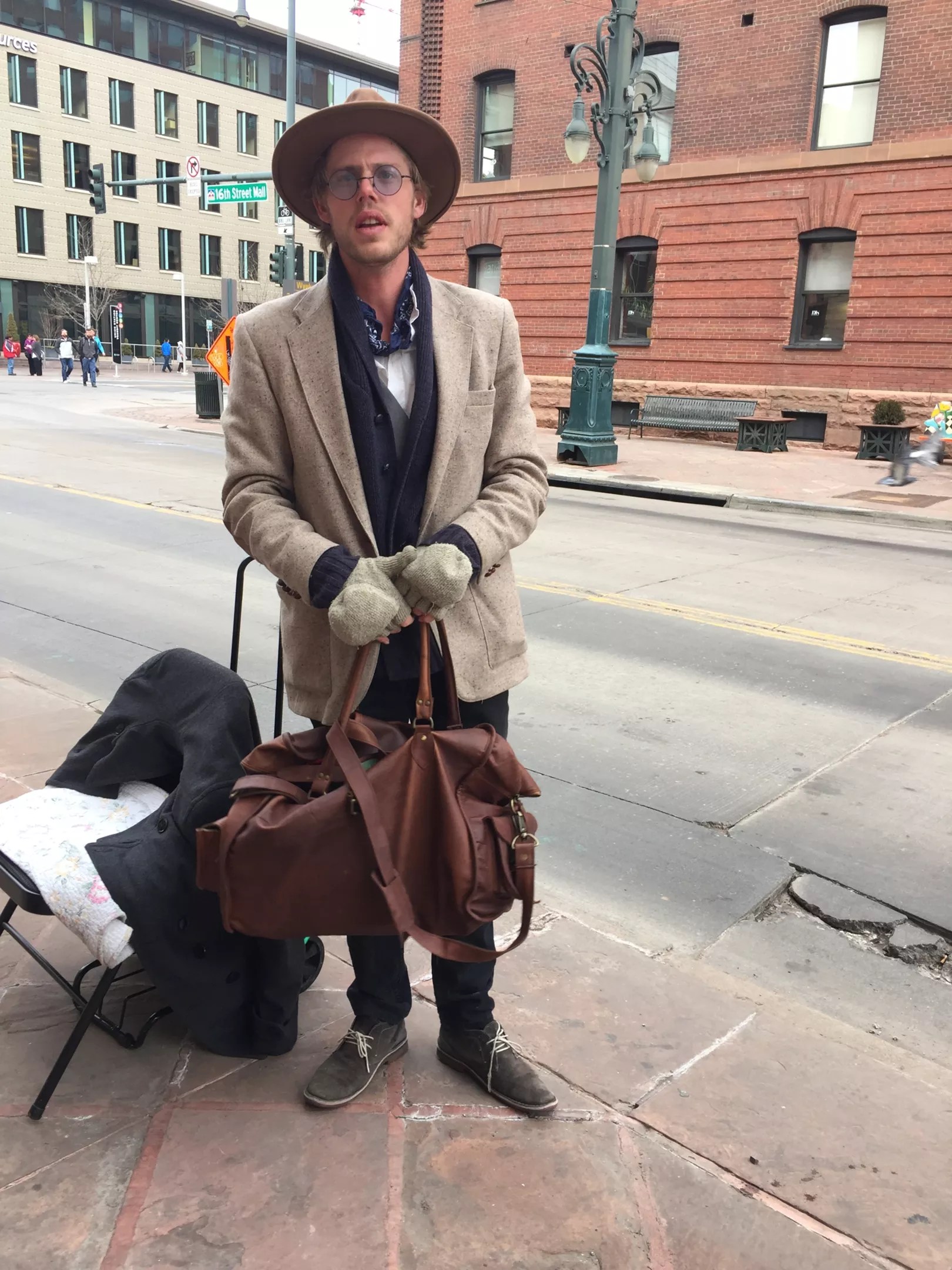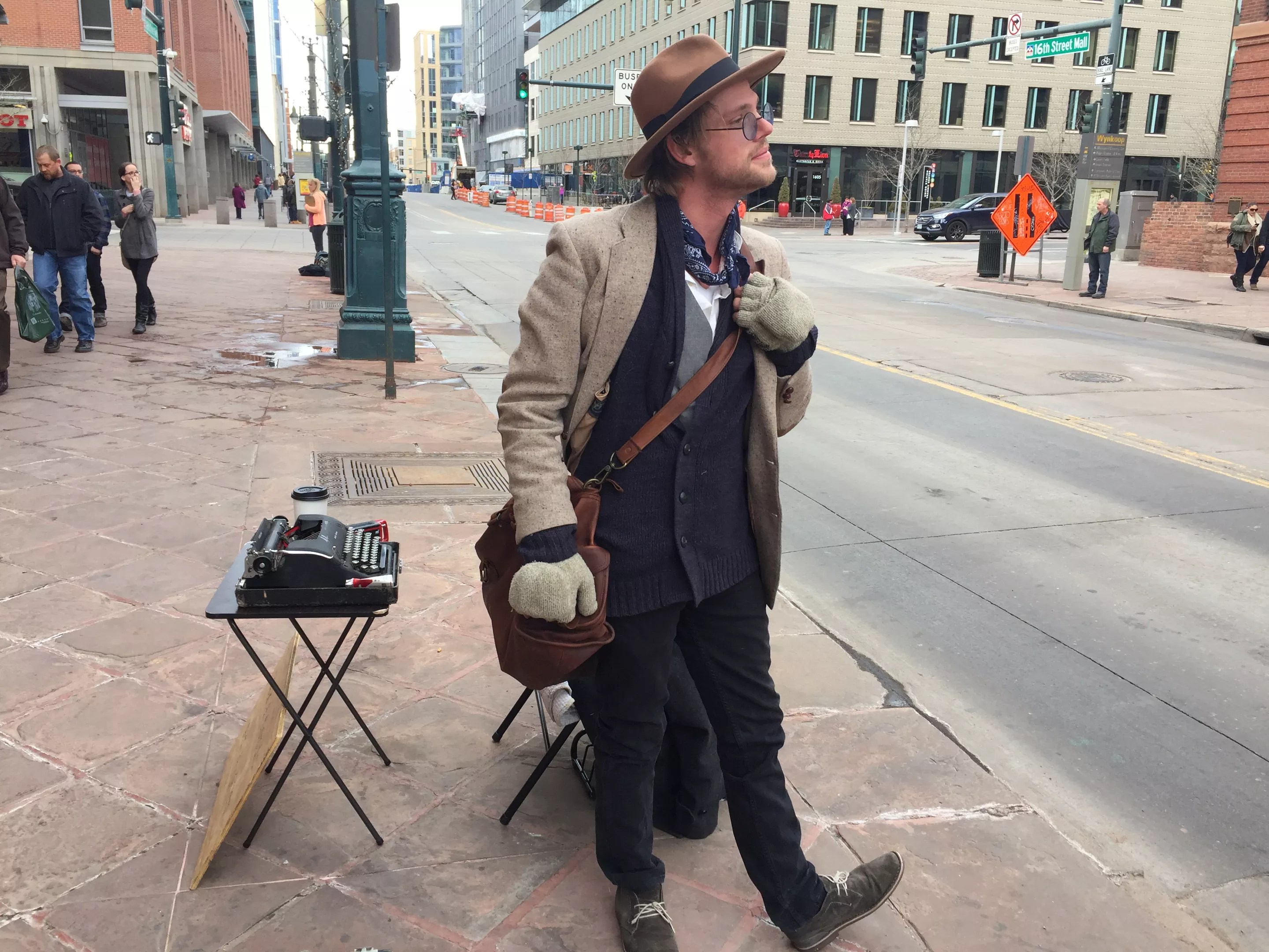 Poet Devan Michael Kingsford creates poems on the fly. Give him a theme and a donation, and he’ll type up a piece relating to the topic. I’ve seen Kingsford peddling poetry on South Broadway, outside of the Meadowlark in RiNo and, most recently, by the downtown Tattered Cover. A 2014 graduate of Metropolitan State University of Denver, Kingsford is based in Colorado but has traveled the United States writing poetry for people. While his look is bohemian-chic with a vintage flair, Kingsford’s best accessory may be his typewriter. After years of sightings, when I encountered him on the 16th Street Mall, I finally stopped to chat with Kingsford about what inspires his fashion and his poetry, and about the artistic life in general. Devan Kingsford’s accessories include a bandanna, blue-tinted sunglasses, fingerless gloves, a brown leather bag and a camel fedora. Photo by Mauricio Rocha