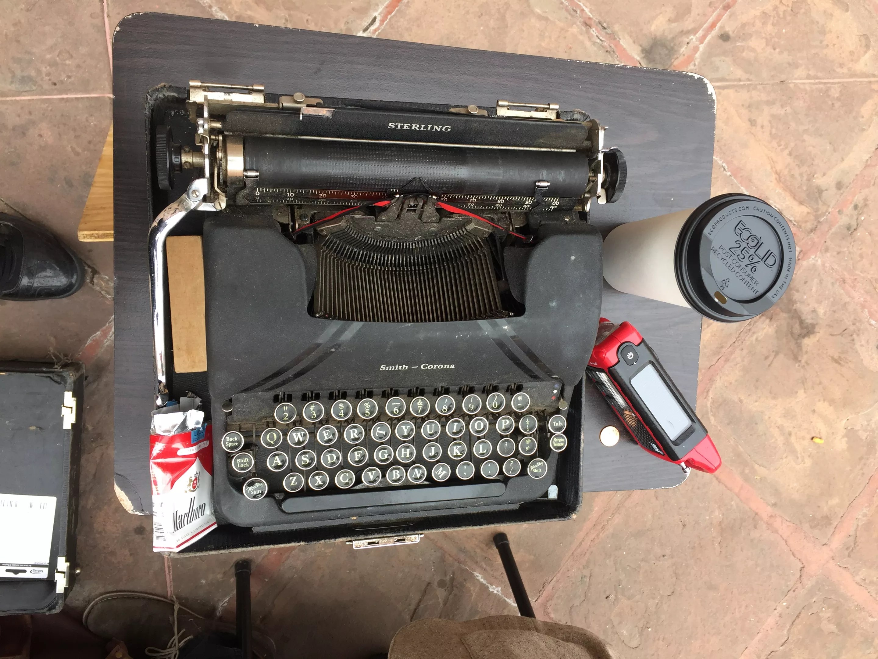 Four working typewriters: two Smith Coronas, a Remington and a Royal.
