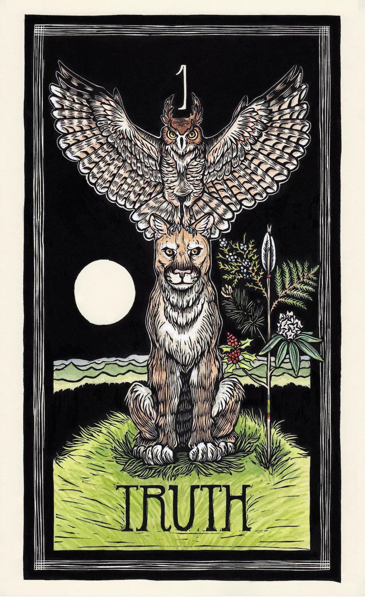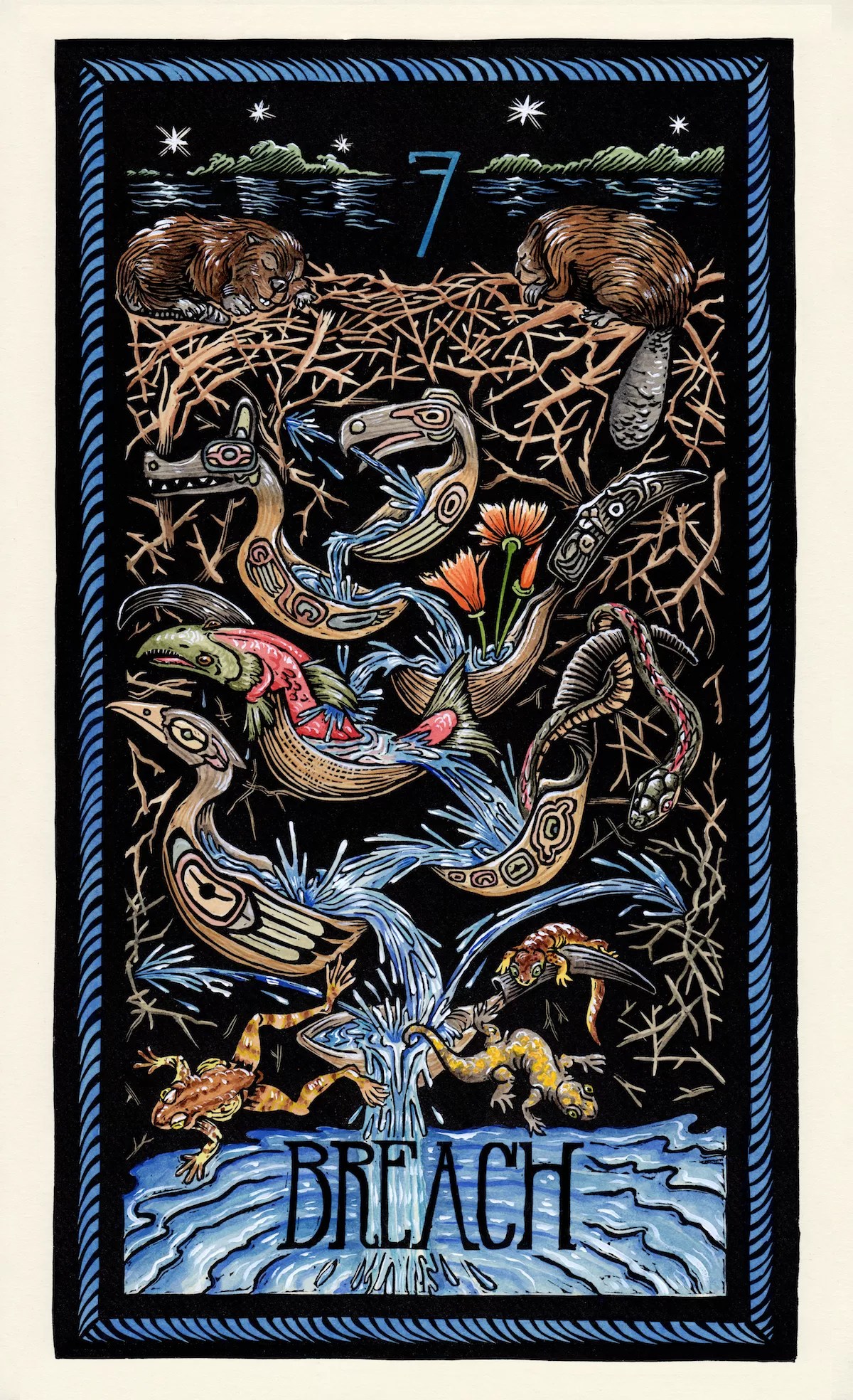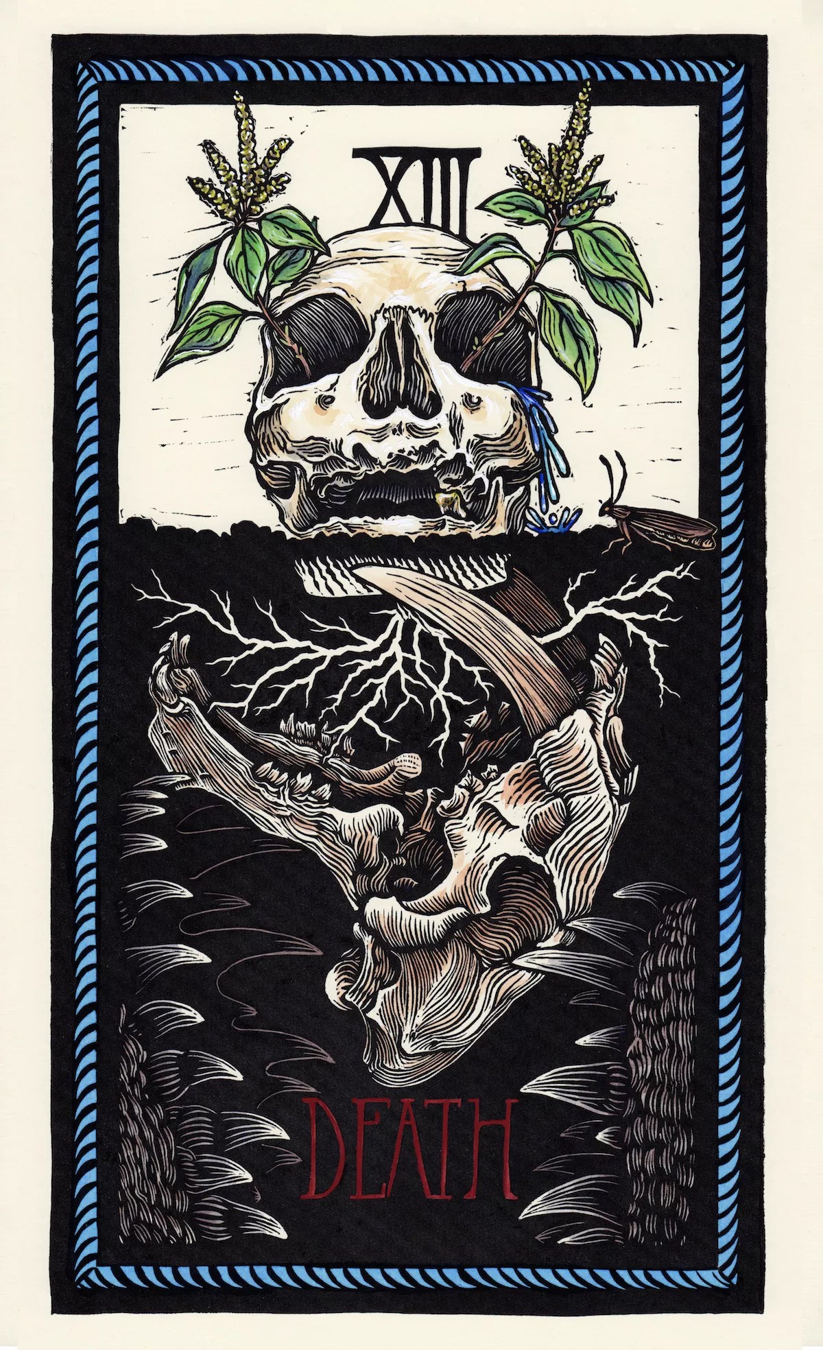 The Brady Tarot. It is by far the largest and most cohesive body of work I’ve created. Plus, it’s a tool that can be used in lots of different ways, which is such a unique and personalized way for a viewer to connect to your work. I’ve only recently completed it, and all 79 hand-colored linocuts will be on view at Syntax Physic Opera. The opening reception is Friday, July 13. [See below for details.]