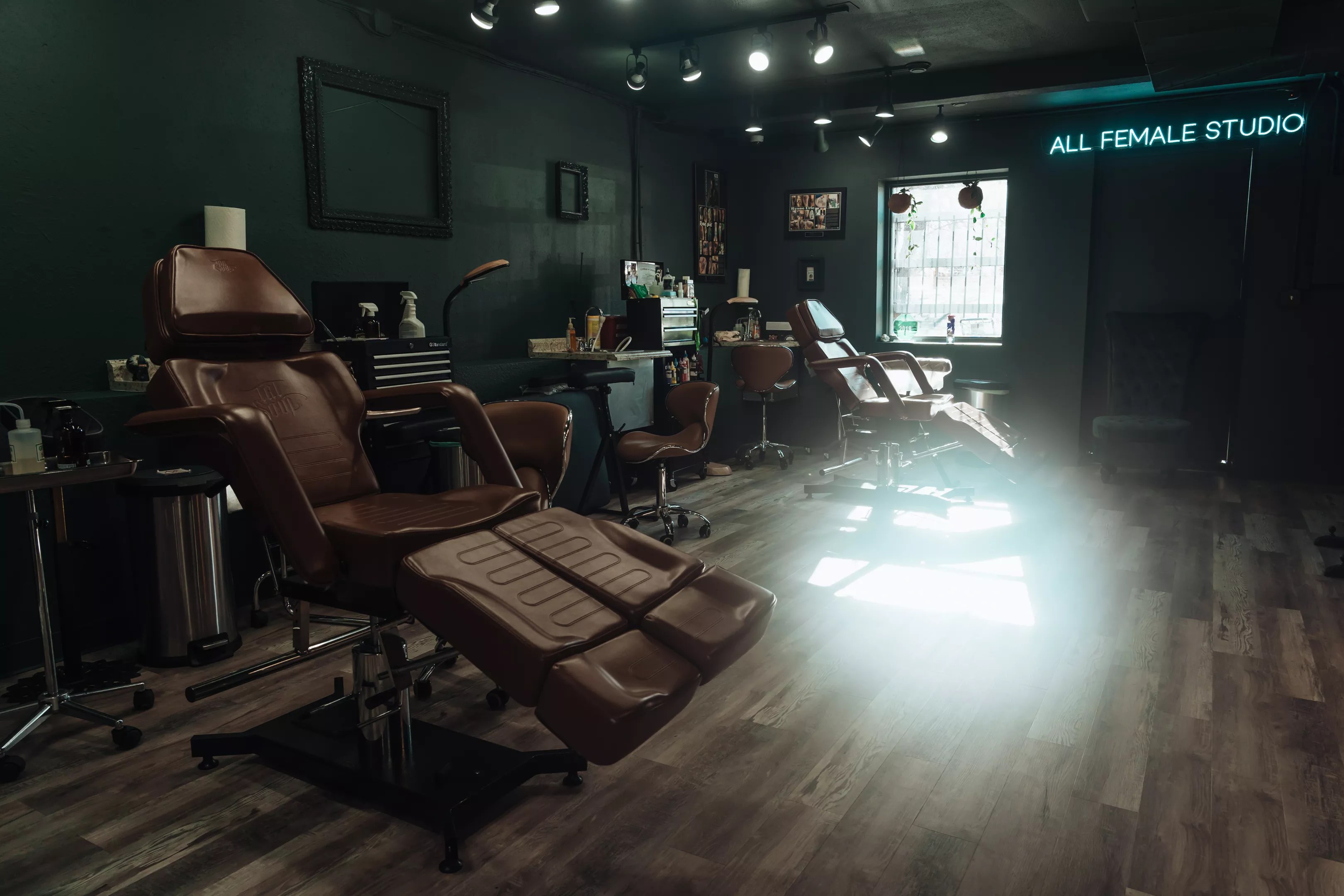 The Wolf Den’s atmosphere is diametrically opposed to that of the stereotypical macho tattoo parlor. Customers enter into an art gallery with a comfortable green couch and dainty tables topped with candles. One open spot on the wall is reserved for a photo of finished tattoos, making body art a part of the gallery. From there, a sleek glass door leads into the parlor, where three walls are painted forest green and the fourth is covered with wallpaper depicting a misty forest landscape. Softly glowing neon signs read “All Female Studio,” “Do What You Love” and “We Aren’t Sheep.” Calming music fills the space, which is festooned with houseplants. If it weren’t for the tattoo chairs and gear, the studio could pass for a bohemian massage parlor.