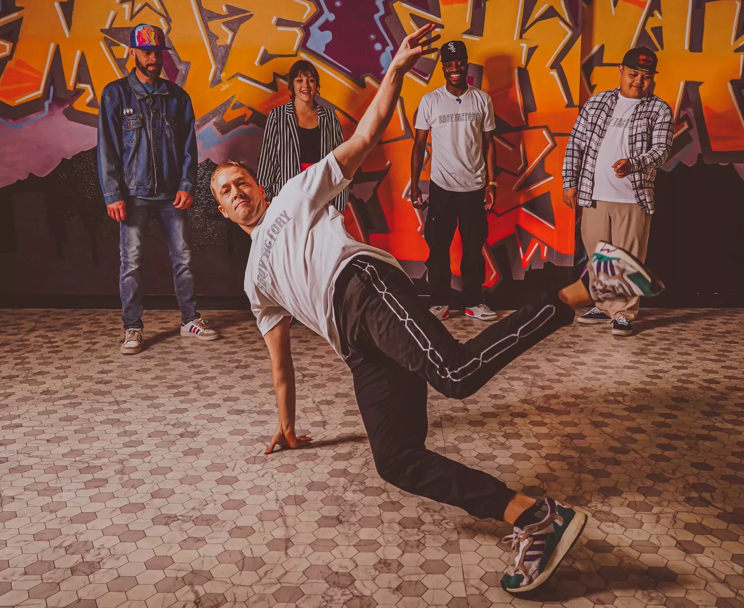 The studio is tucked in an industrial building between an auto glass shop and an HVAC company in north Denver. Unassuming from the parking lot, once you step inside and you’re struck by the drone of fans, which are immediately overpowered by a large speaker booming remixed funk music and breakbeats. One wall is covered with mirrors, the opposite wall is covered with a 30-foot-wide, floor-to-ceiling graffiti piece, complete with original hip-hop imagery — vivid scenes of breakers, an alien spacecraft spinning records on turntables, and a can of spray paint wearing a Kangol hat. Bboys and Bgirls of all ages might be stretching to prepare for a class, and it wouldn’t be out of the ordinary to see an eight-year-old spinning on top of their head.