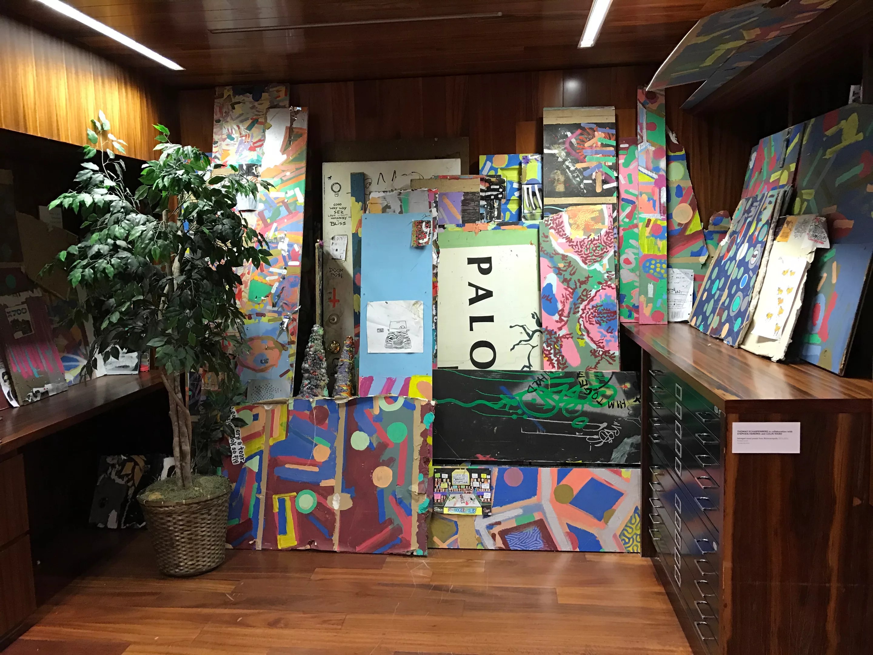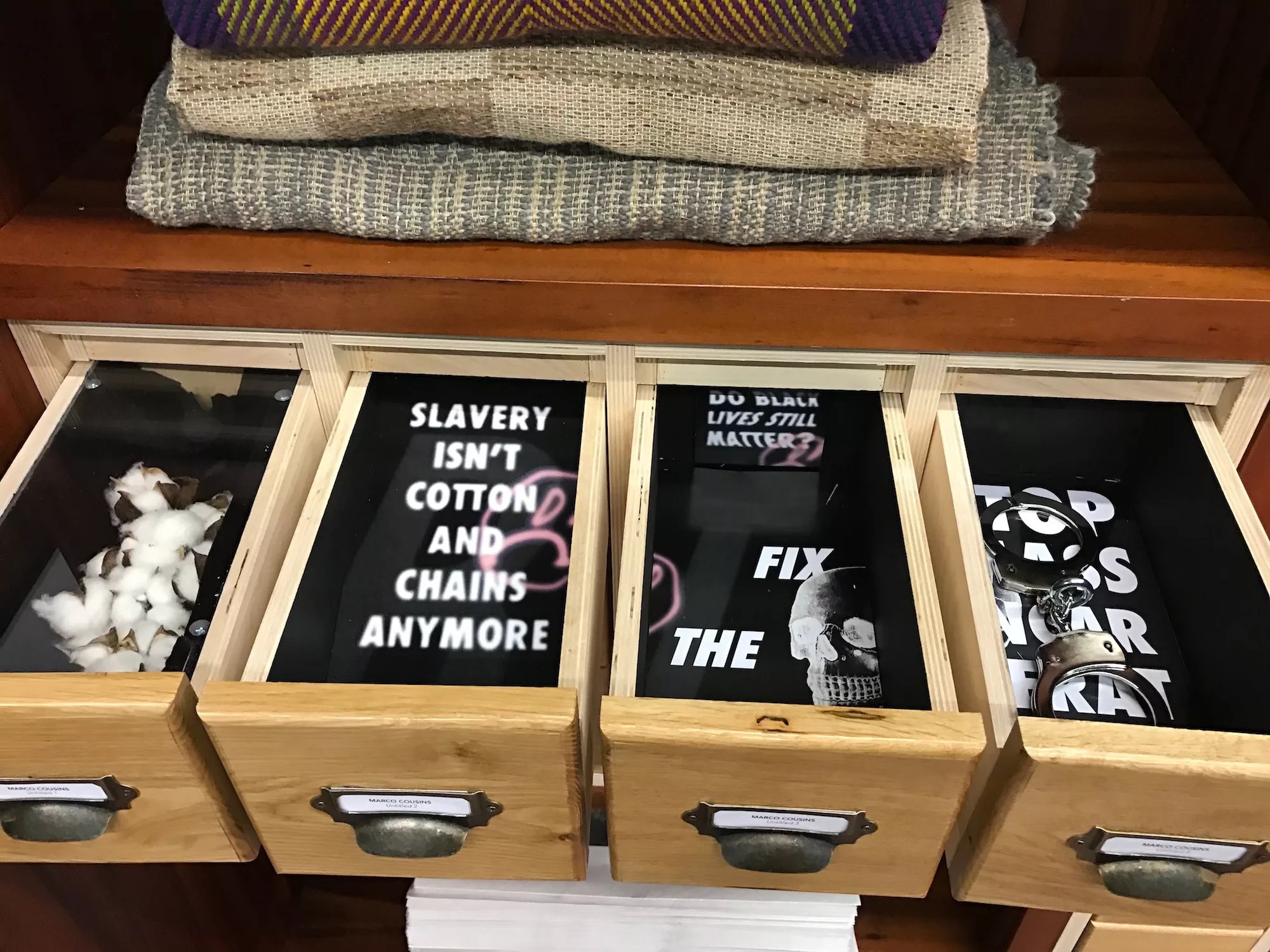 First, he built a series of card catalogues and commissioned five young artists from diverse backgrounds to create works that fit inside the drawers. Corey Feder’s “Hi, It’s Me,” is a charming ceramic comic book with pages unfolding in each drawer, while Marco Cousins’s drawers open in succession to deliver a Black Lives Matter call to arms. Patrice Renee Washington’s ceramic inserts ape actual catalogue cards, with each drawer opening to the card of a book written by an African-American woman. Raúl Romero’s “A to Z” contains audio tapes of earworm music, and Amna Ashgar filled her drawers with tiny screen prints.