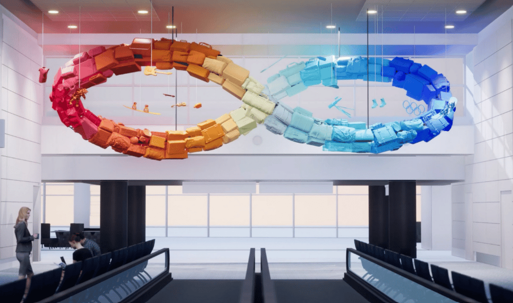 The suitcases will be painted in colors that represent the sunrise and sunset and used to construct a shape akin to the infinity symbol, which Evans says is “influenced from the idea of takeoff and landing — a looping shape where it just never ends, because DIA never is closed…and basically, there’s always a plane in the sky.