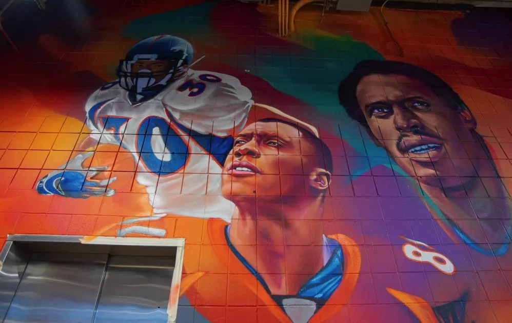That recognition, as well as past work with Tamara and Damani Leech, now president of the Denver Broncos, led to a dream project for Evans: painting a mural at Mile High Stadium. The piece depicts Broncos Hall of Famers and is located outside the team store at Empower Field. “I wanted to talk with [Leech] about doing murals and then get them to beef up the project and get them in the idea of doing more murals when they took on that project,” Evans says. “And now we have quite a few of us in there painting murals the past couple of weeks, and then hopefully, they’ll want to add more later in the season and next year.”